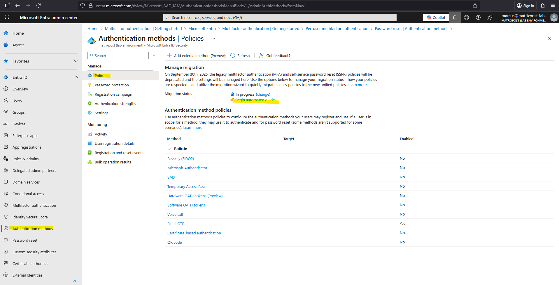 The automated migration guide lets you migrate where you manage authentication methods in just a few clicks. It can be accessed from the Microsoft Entra admin center by browsing to Entra ID > Authentication methods > Policies.