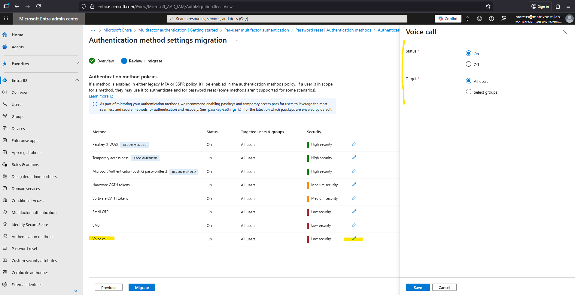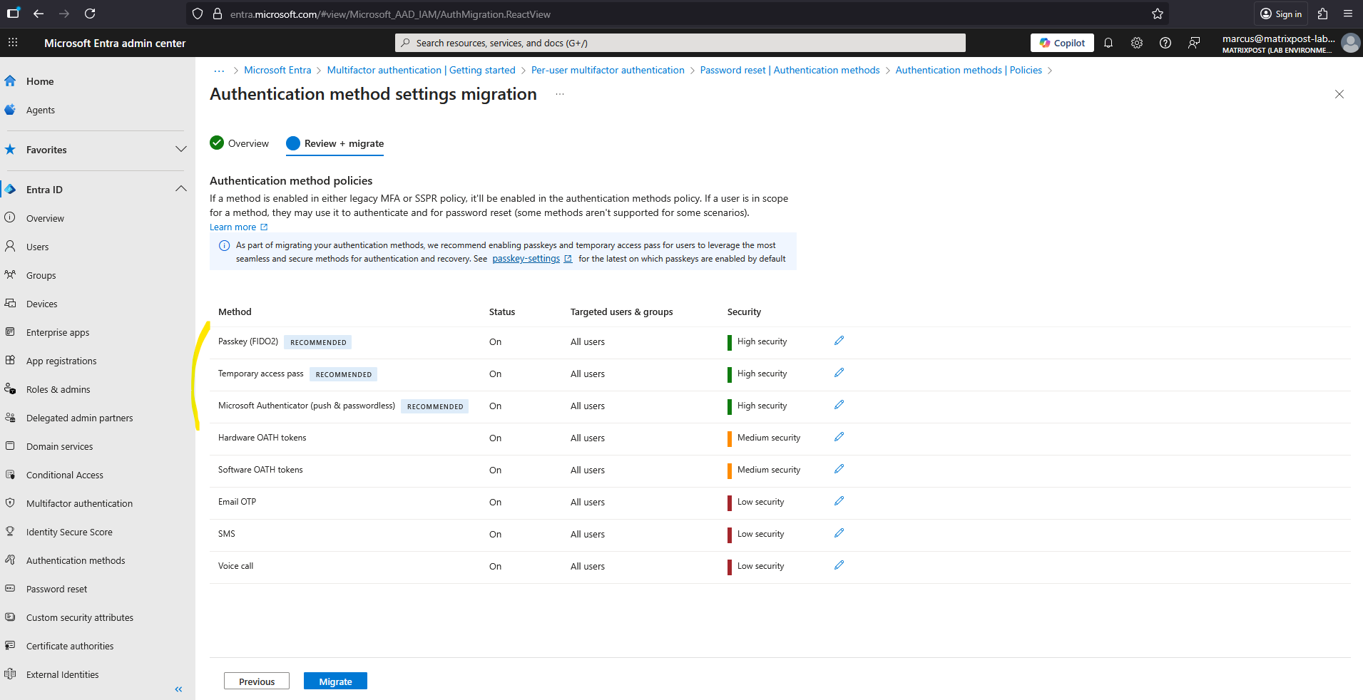 Finally select Migrate, and then confirm the migration. The Authentication methods policy gets updated to match the configuration specified in the wizard.