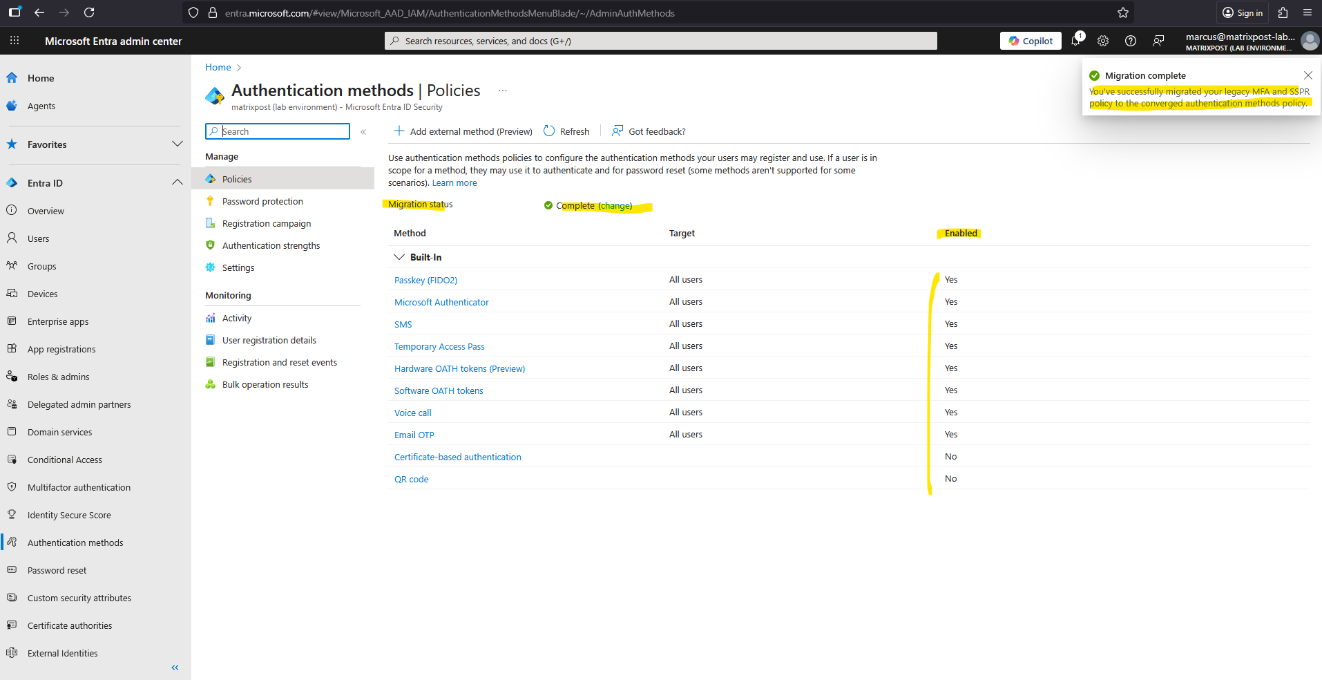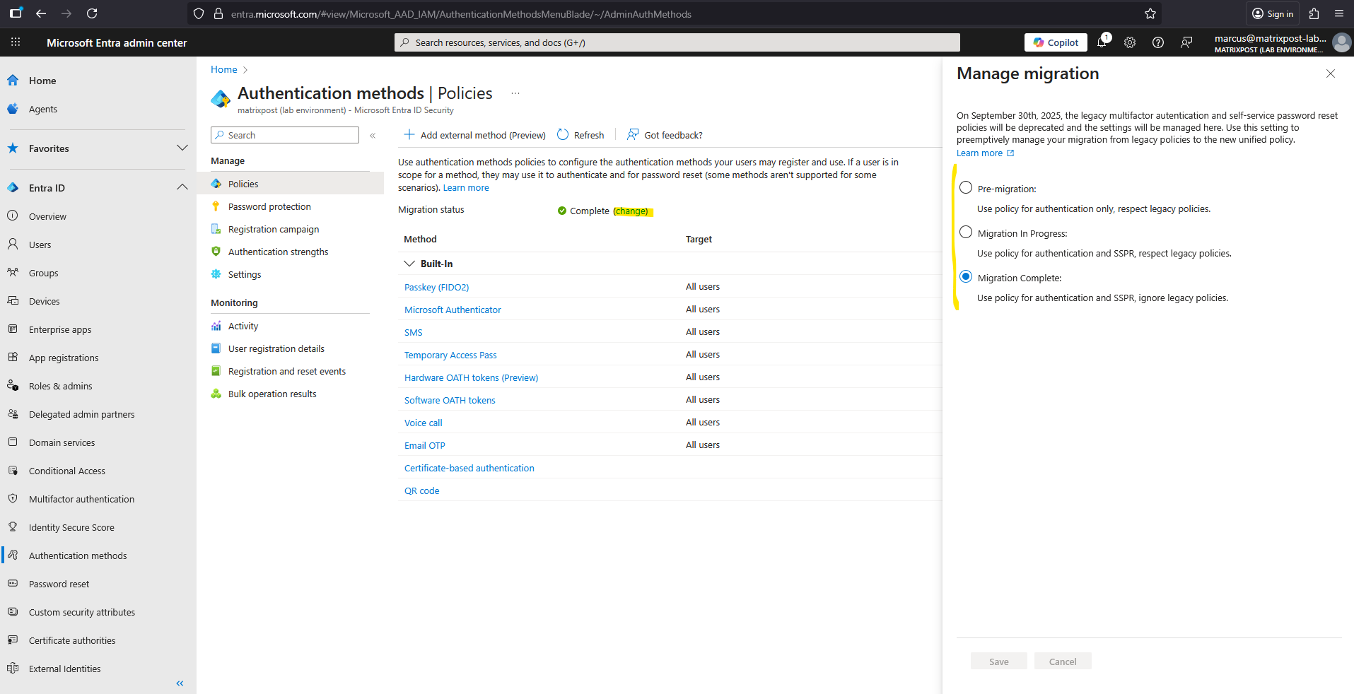 In this mode, Microsoft Entra-only follows the Authentication methods policy. No changes can be made to the legacy policies if Migration Complete is set, except for security questions in the SSPR policy. If you need to go back to the legacy policies for some reason, you can move the migration state back to Migration in Progress at any time.