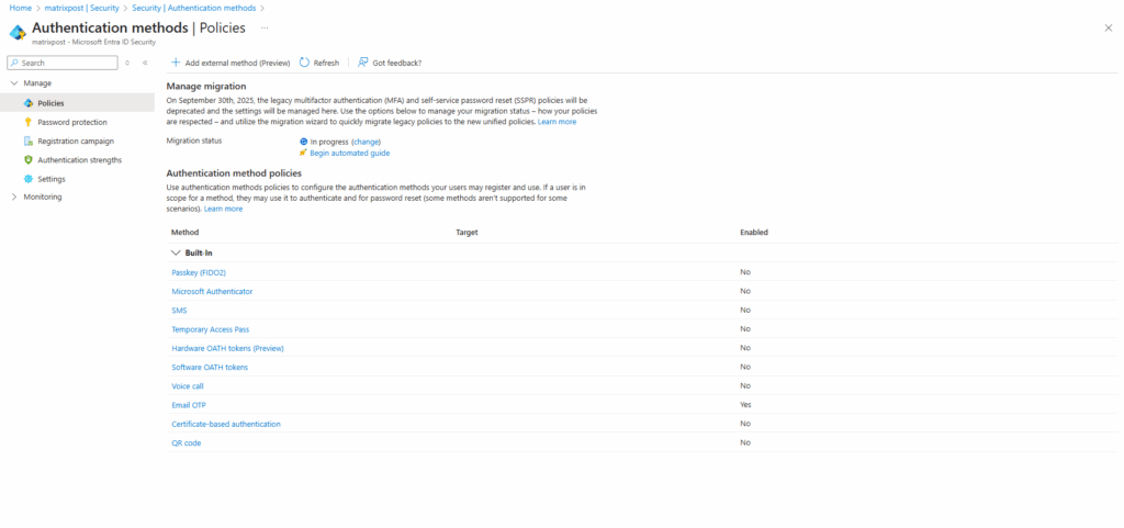 A new tenant has all methods Off by default, which makes migration easier because legacy policy settings don’t need to be merged with existing settings.