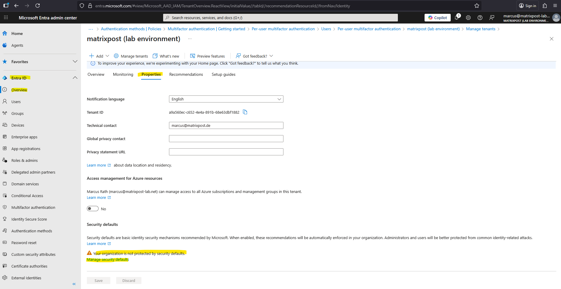 Go to Microsoft Entra Admin Center Entra ID > Properties > Manage Security Defaults.