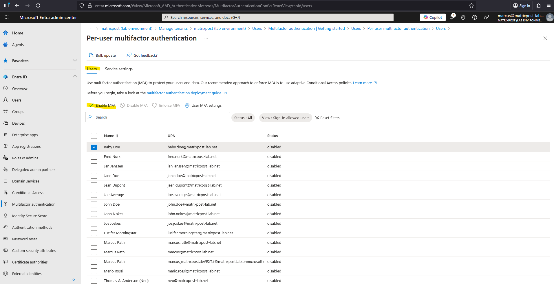 Select the users you want to enable or disable MFA and click on the corresponding option below.