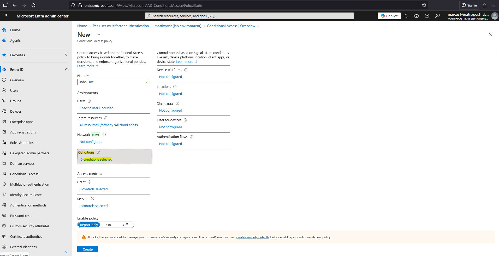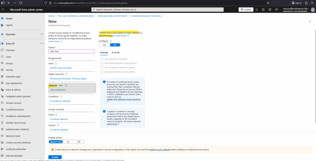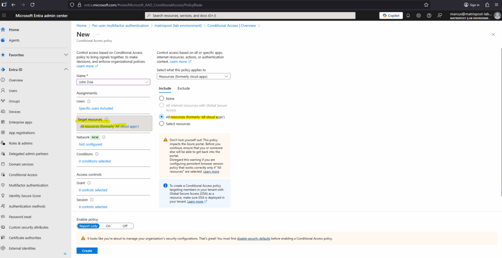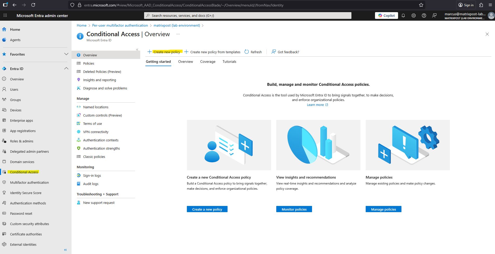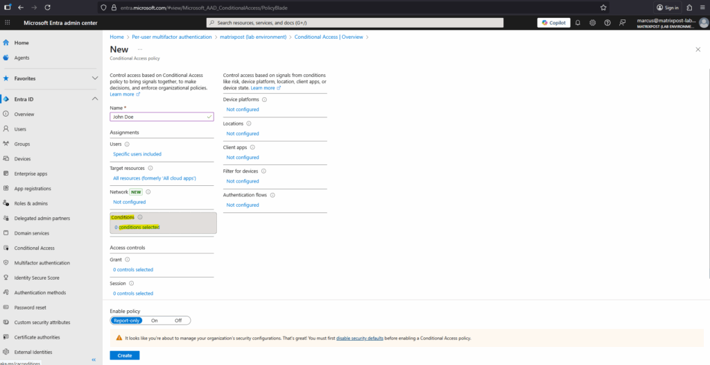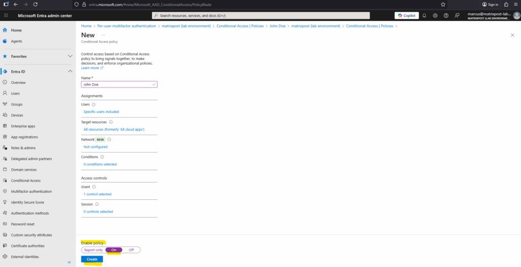 Go to Microsoft Entra Admin Center Entra ID > Conditional Access > Overview -> Create new policy.