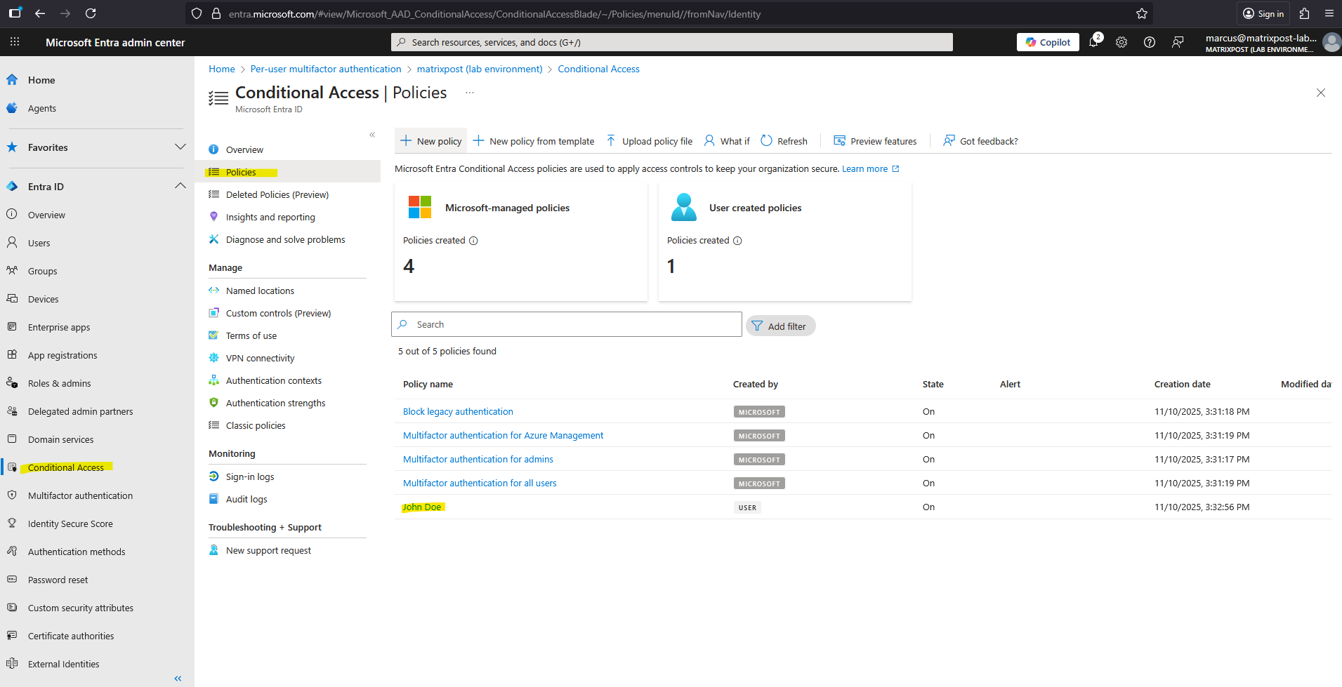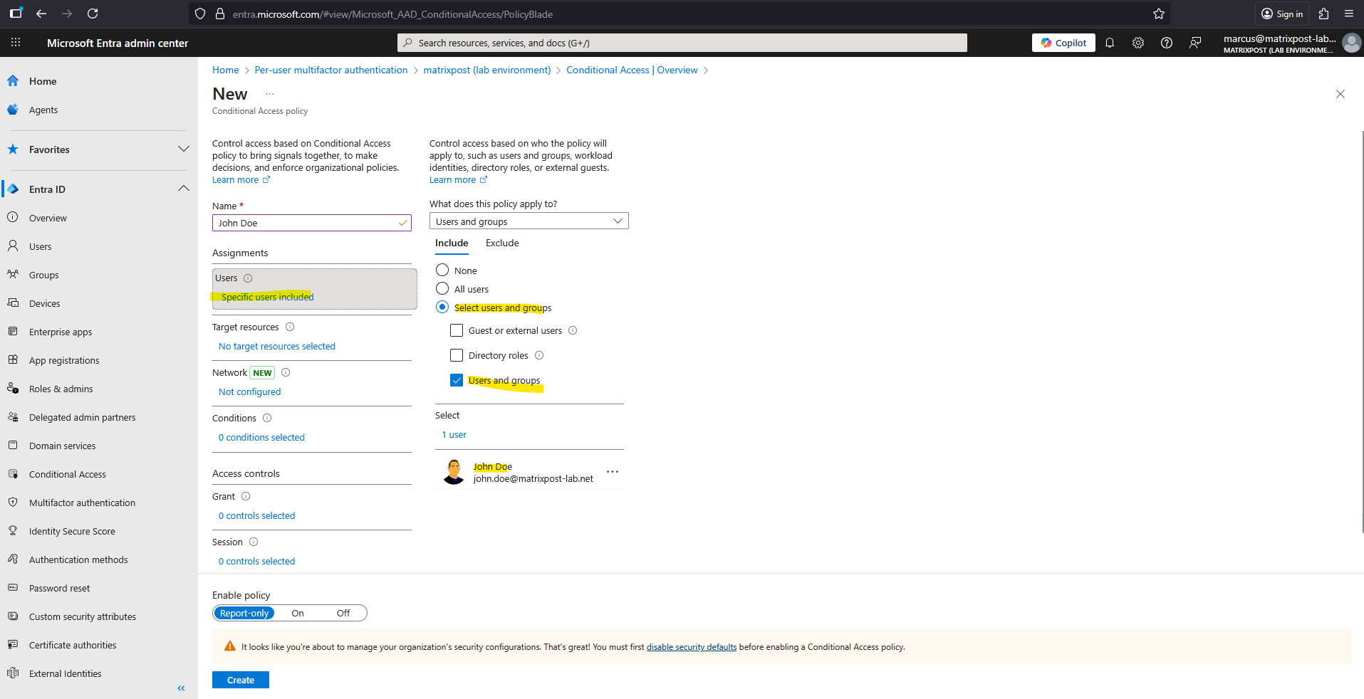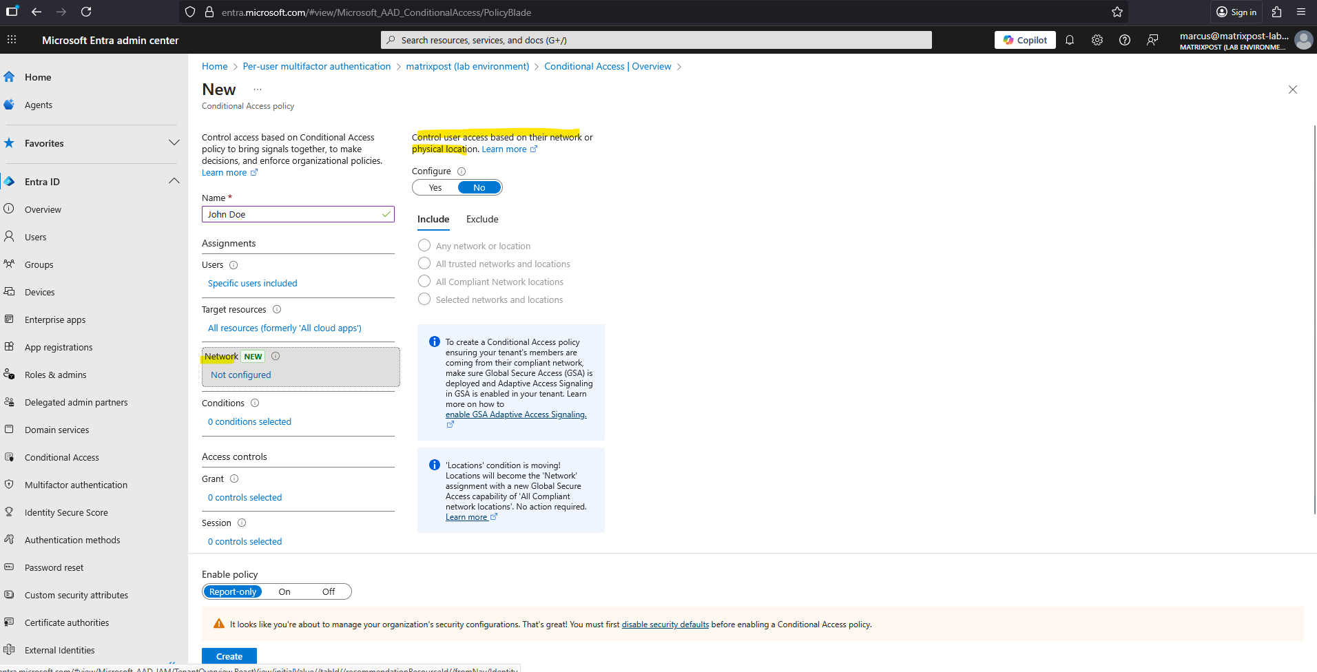 Go to Microsoft Entra Admin Center Entra ID > Conditional Access > Overview -> Create new policy.