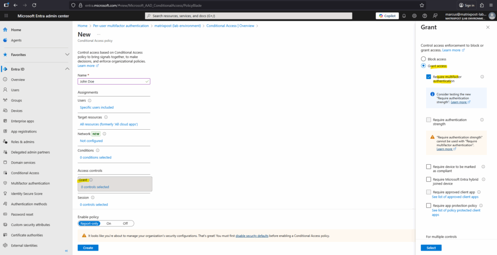 Here you can choose to block access entirely or grant access only if additional requirements, such as requiring multifactor authentication, compliant devices, or approved client apps, are satisfied.