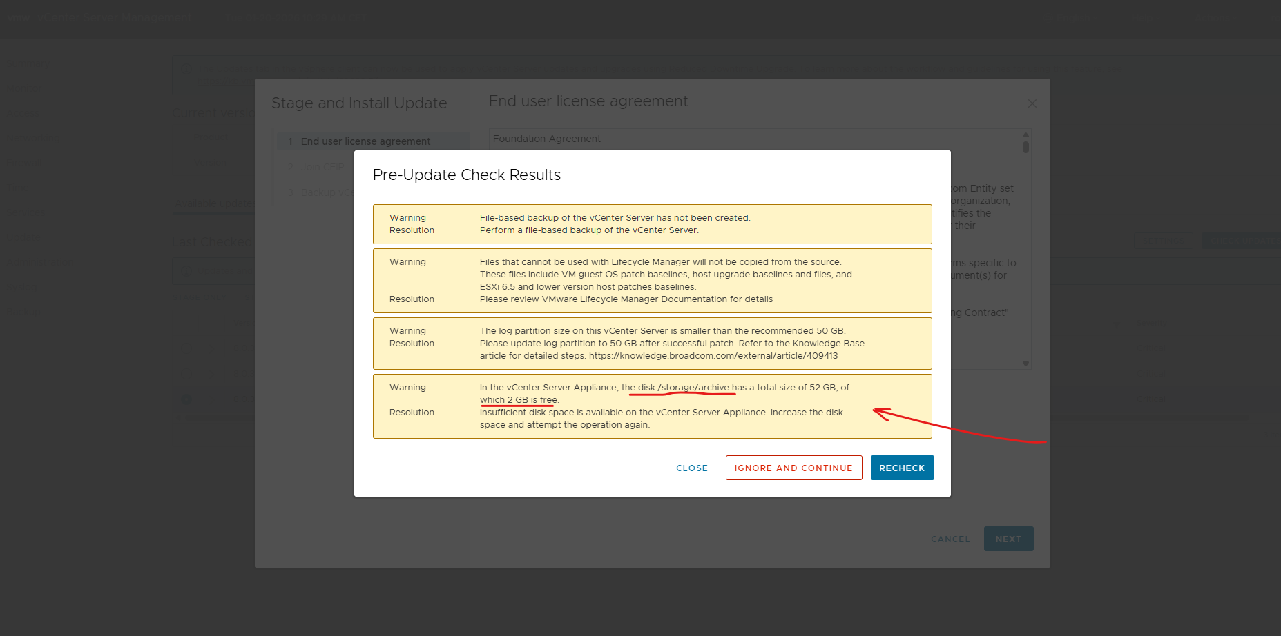 The upgrade will fail if /storage/archive doesn’t have enough free space.