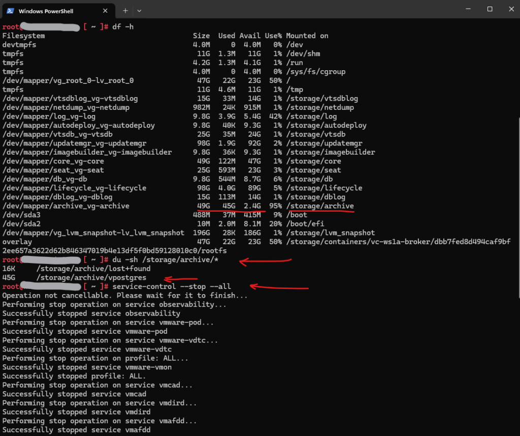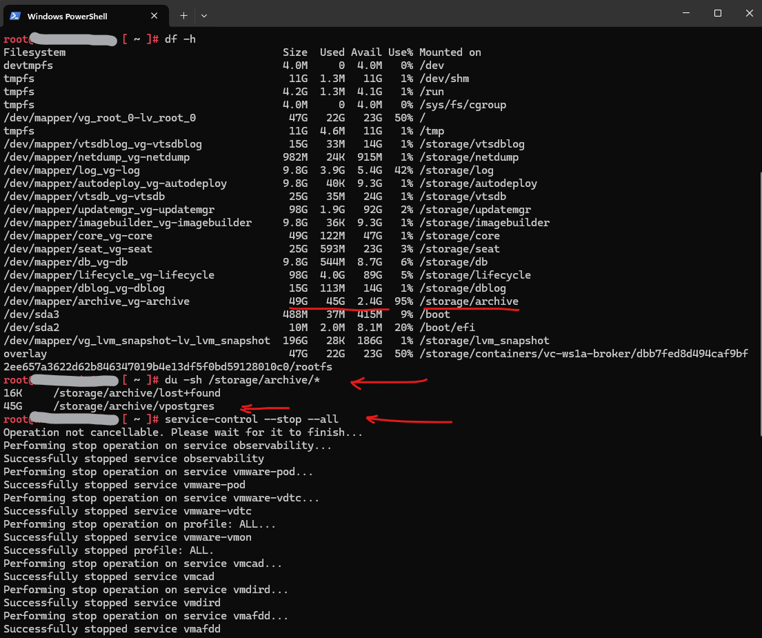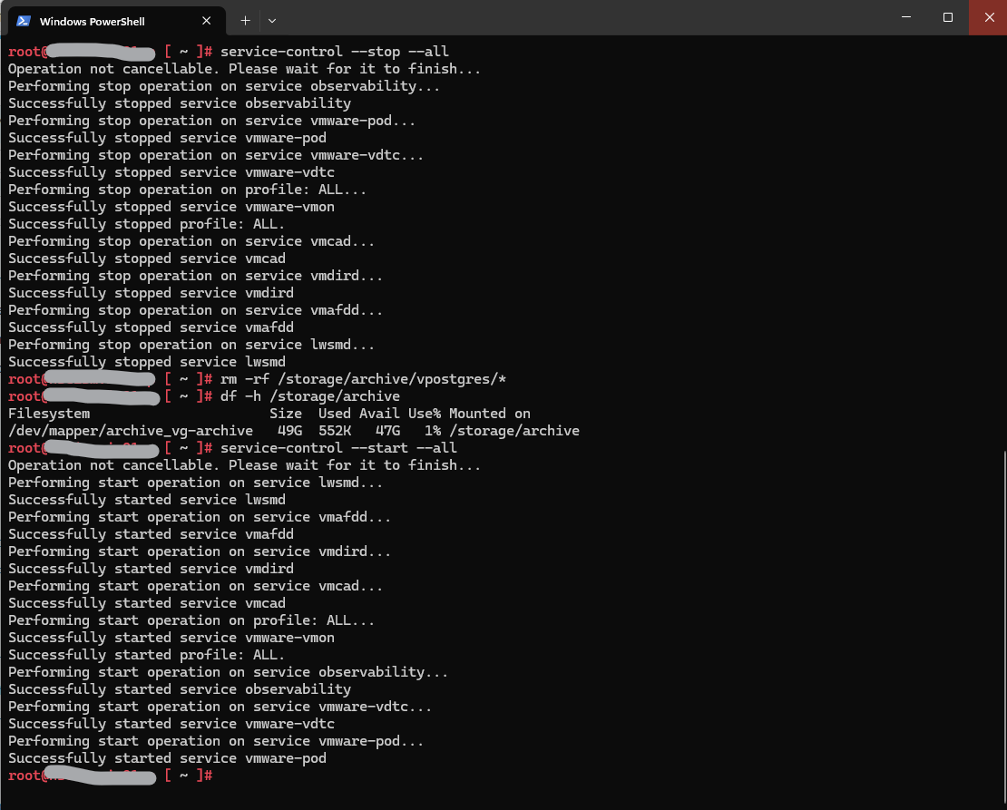 # service-control --stop --all # rm -rf /storage/archive/vpostgres/* # df -h /storage/archive # service-control --start --all