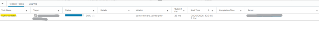 After restarting all vCenter services, the Lifecycle Manager initiated a “Sync Updates” task to re-synchronize update metadata and validate the internal patch and image repositories. This behavior is expected after service restarts or maintenance activities affecting the database. The synchronization finally completed successfully without errors after a few minutes.