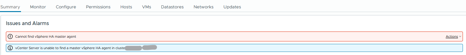 After upgrading vCenter via VAMI, the vSphere Client may temporarily display the warning “Cannot find vSphere HA master agent.” as shown in the screenshot below.
