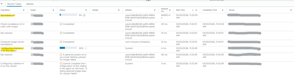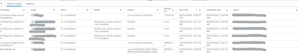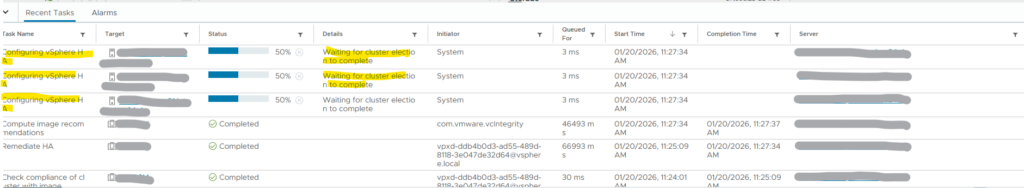 During the post-upgrade phase, the task “Configure vSphere HA” appears for each ESXi host while the cluster performs a new HA master election.