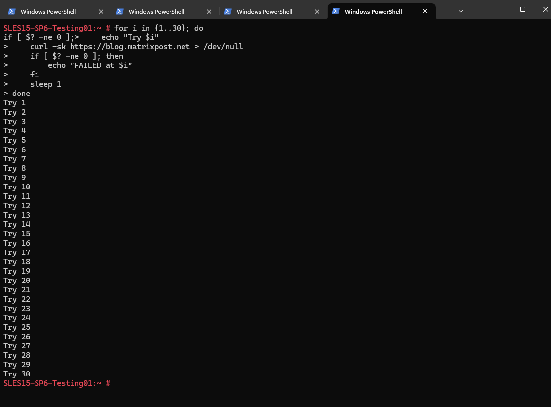 for i in {1..30}→ loop 30 timescurl -sk→ silent + ignore certificate errors> /dev/null→ throw away outputif [ $? -ne 0 ]→ check curl exit statusecho "FAILED at $i"→ show only failuressleep 1→ wait 1 second between tries