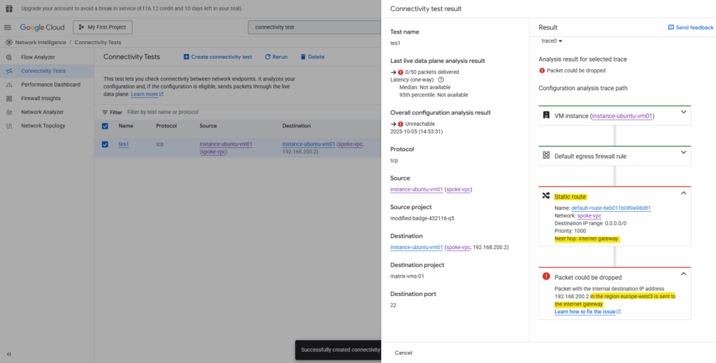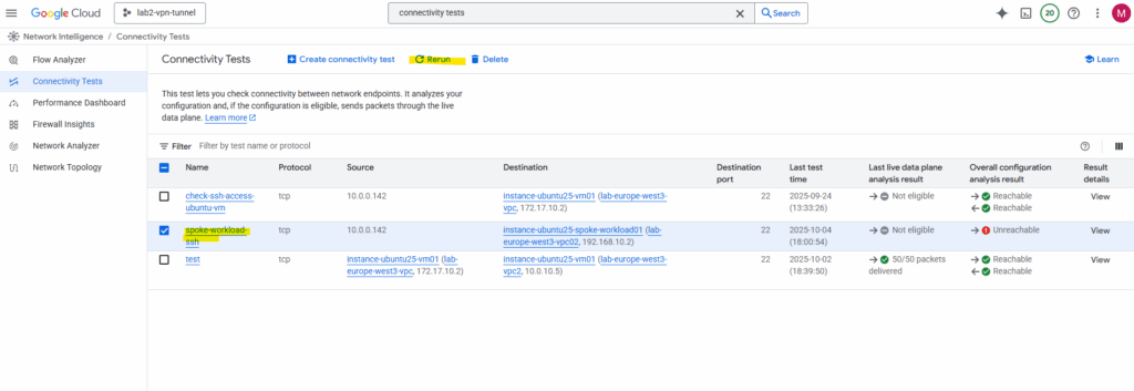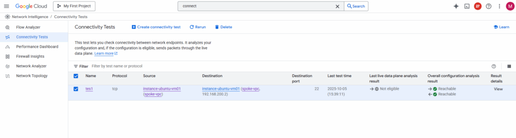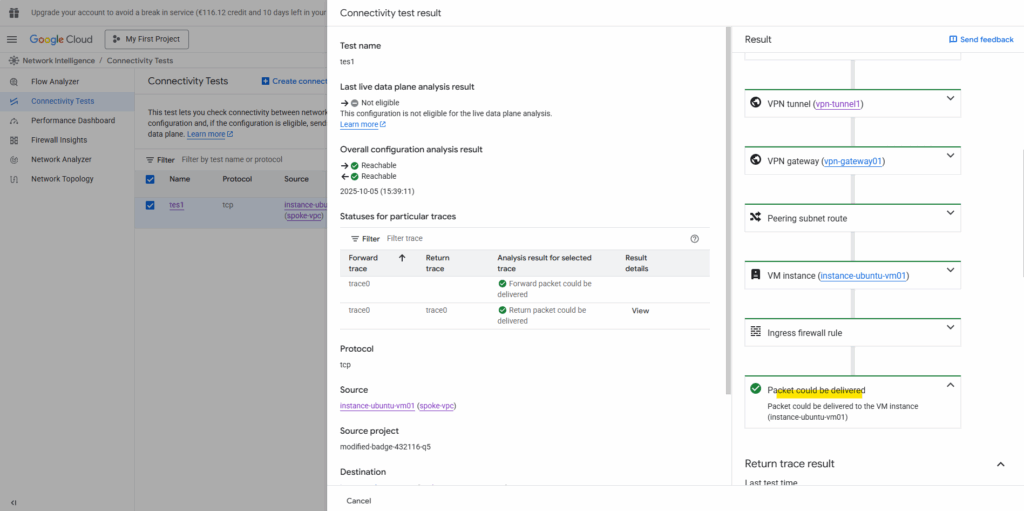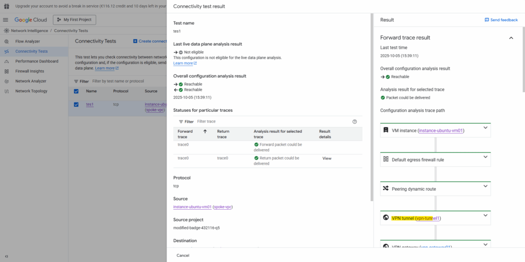 Before I will try to ping (Echo request messages) the VM instance (workload) on the other side (project) and spoke VPC network, I will first run again the connectivity test.