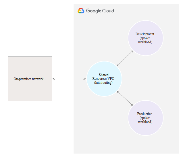 Other workloads are placed in spoke VPCs. Each spoke is typically tied to a specific environment (e.g., dev, test, prod) or business unit, and connects back to the hub through VPC peering or transit routing via a Shared VPC.