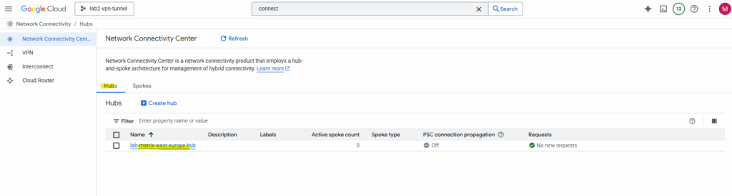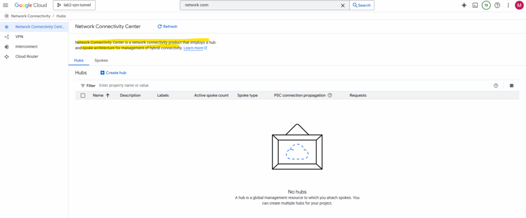In the Network Connectivity Center on the Hubs tab click on Create Hub.