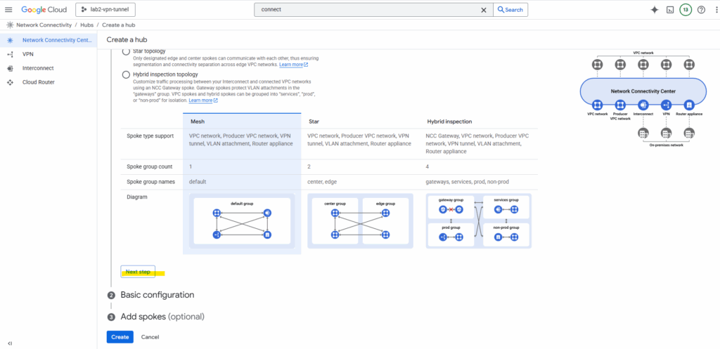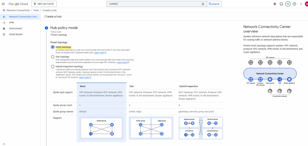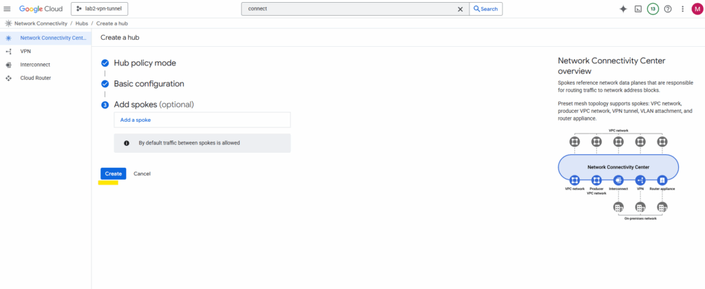The hub is where we will connect both our HA VPN and our spoke VPCs.