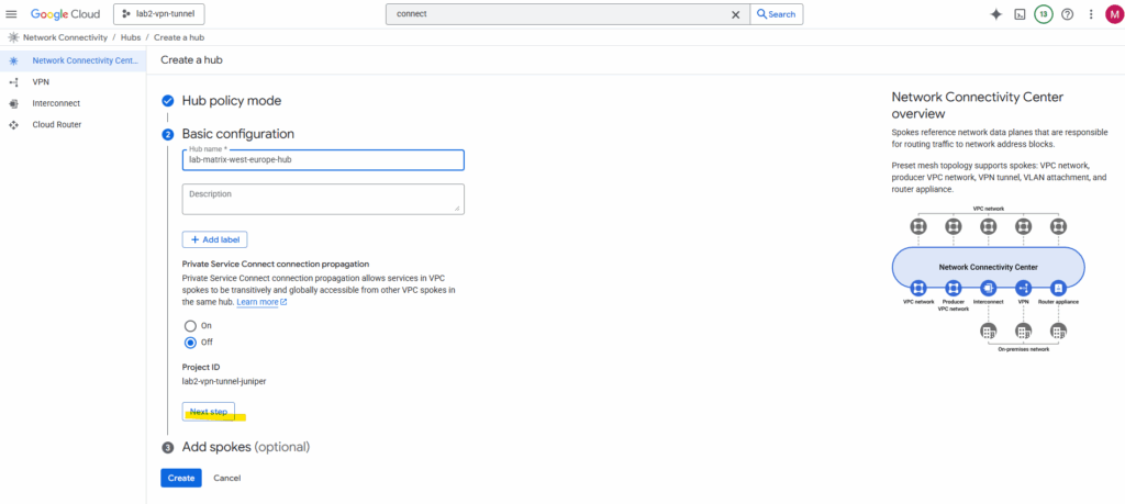 Enter a name for the Hub and select if Private Service Connect connection propagation is enabled.