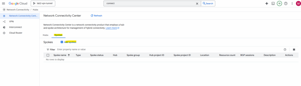 In the Network Connectivity Center on the Spokes tab click on Add spokes.
