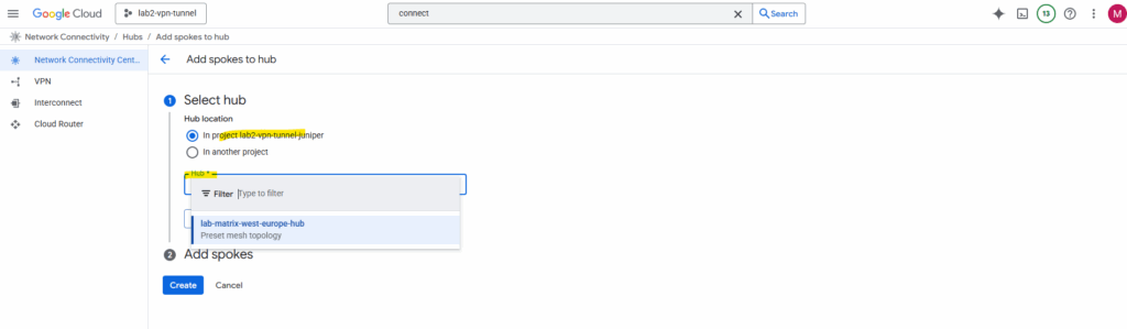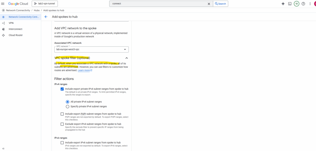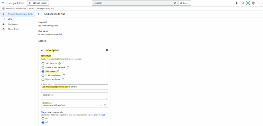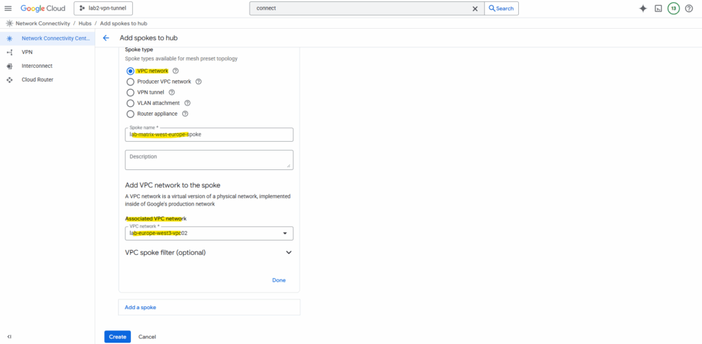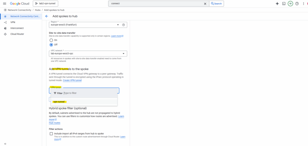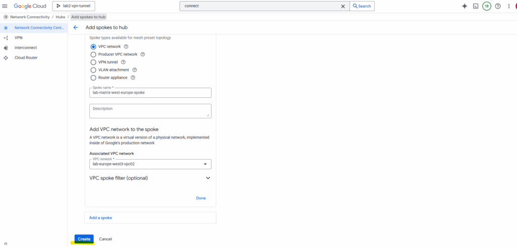 For the spoke type I will use VPC network. Enter a name and select which existing VPC network you want to add as spoke. I will add here the VPC network named lab-europe-west3-vpc02 which I will use for spoke workloads.