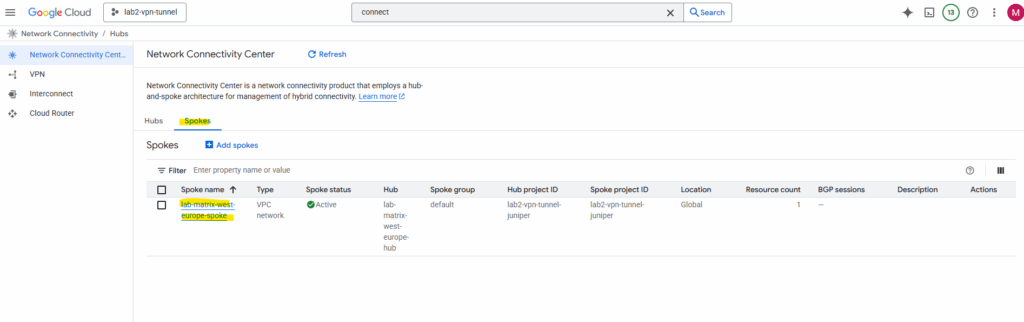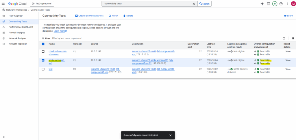 Et voilà, looks good now and regarding the connectivity test traffic can now be sent from the source spoke VPC network and workload successfully to the destination spoke VPC network and workload.