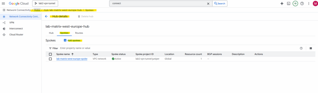 To make our HA VPN available in the hub, we need do add our HA VPN as spoke to our hub.