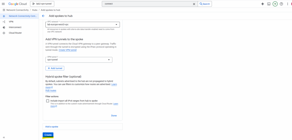 Click on Create. This registers our HA VPN as a spoke so its routes can flow into the hub.