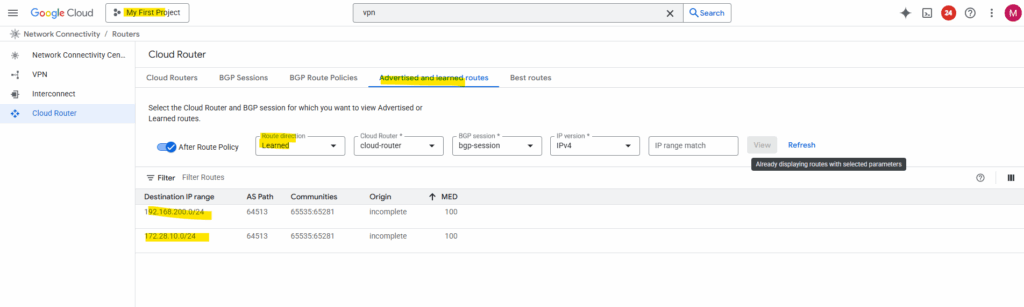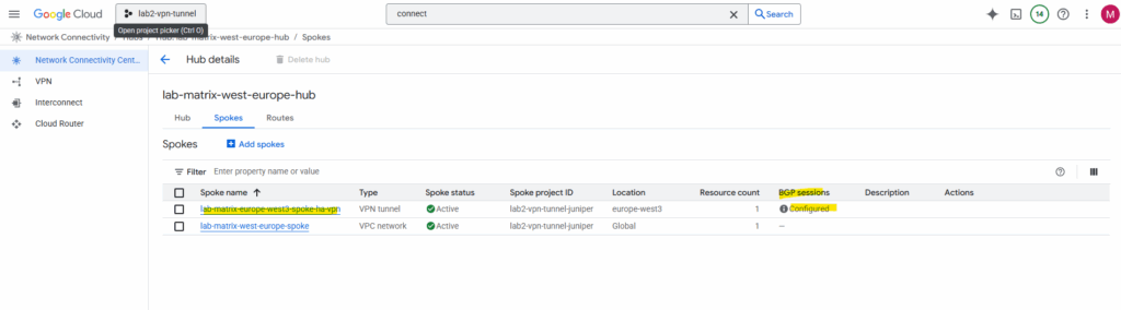 After adding the spoke subnets on both sides (projects), finally all subnets are advertised to the other side.
