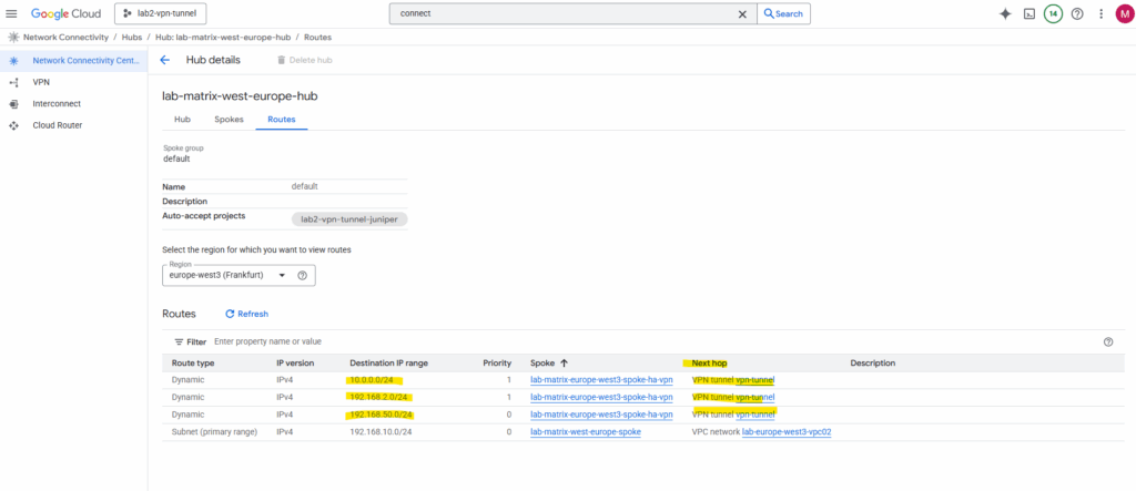 By default, the hub only advertises subnets from its own VPC. To include spoke routes, select Create custom routes on the router details page as shown below.