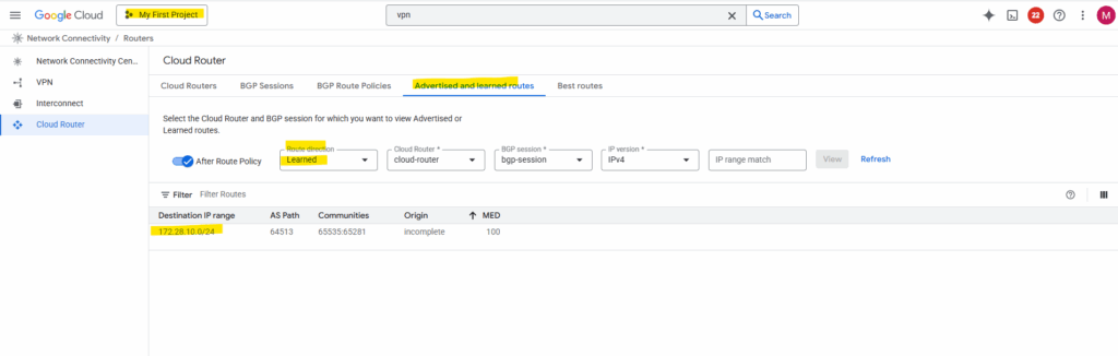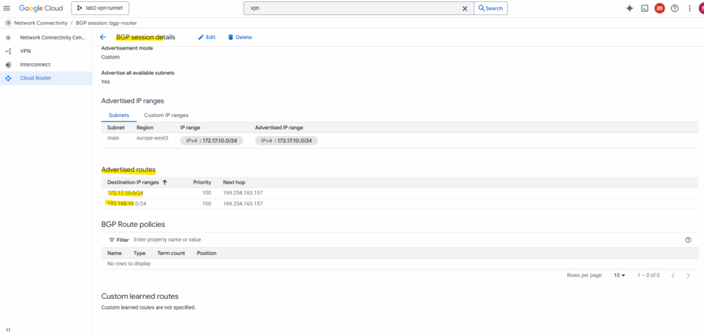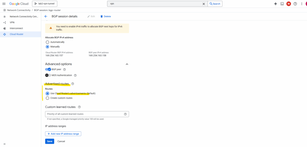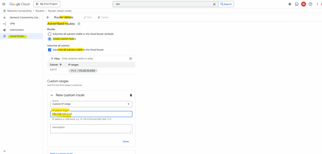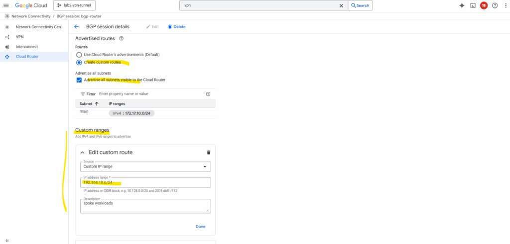 I will check Advertise all subnets visible to the Cloud Router and adding my workload subnet 192.168.10.0/24 which is associated with the spoke.