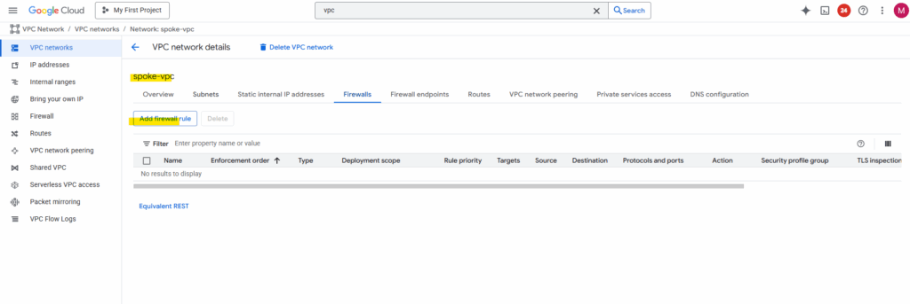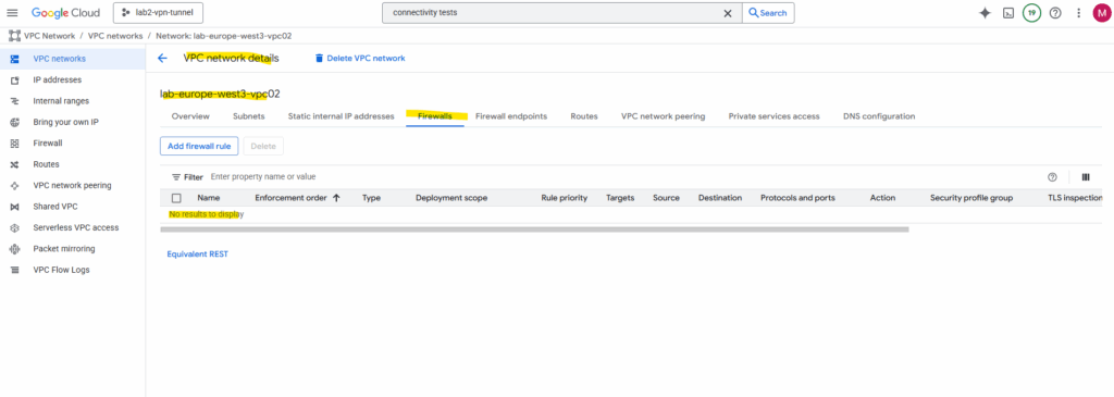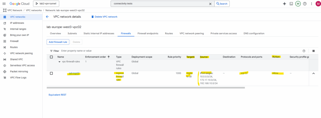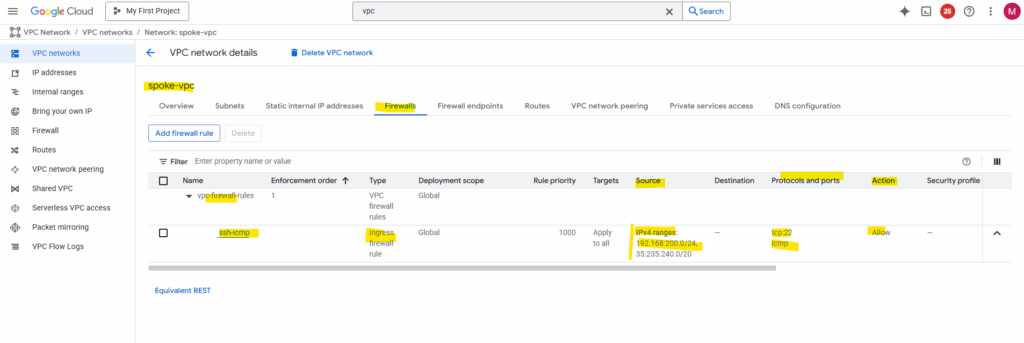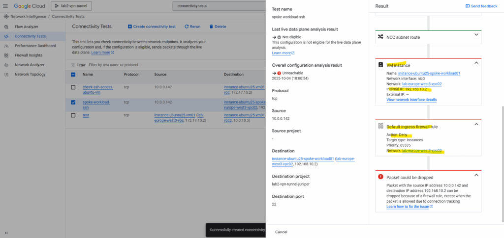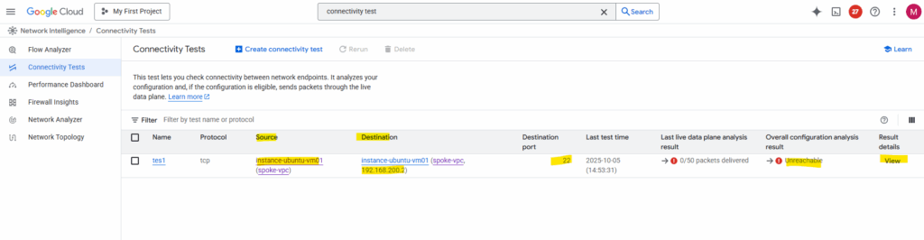 I already know that so far I am not allowing on the destination VPC network (spoke) inbound TCP 22 (SSH) traffic, just to demonstrate that we can use the Network Intelligence – Connectivity Tests tool, to analyze where exactly traffic is blocked.