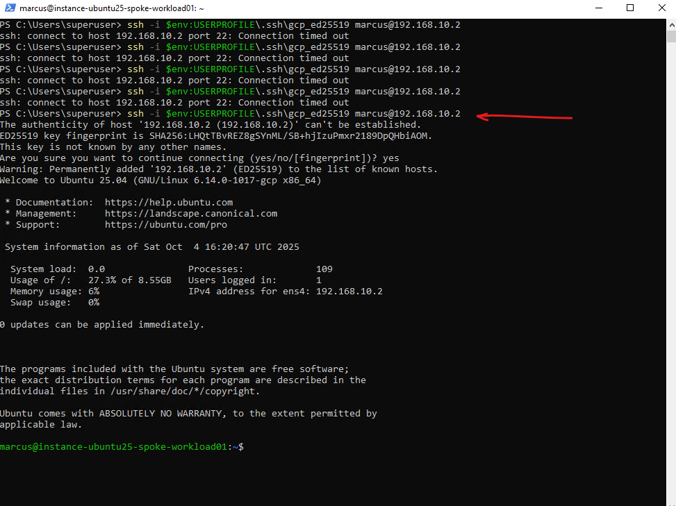 Now I am able to connect to the spoke workload (VM instance) directly from my on-prem network.