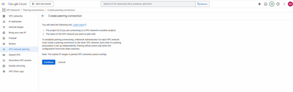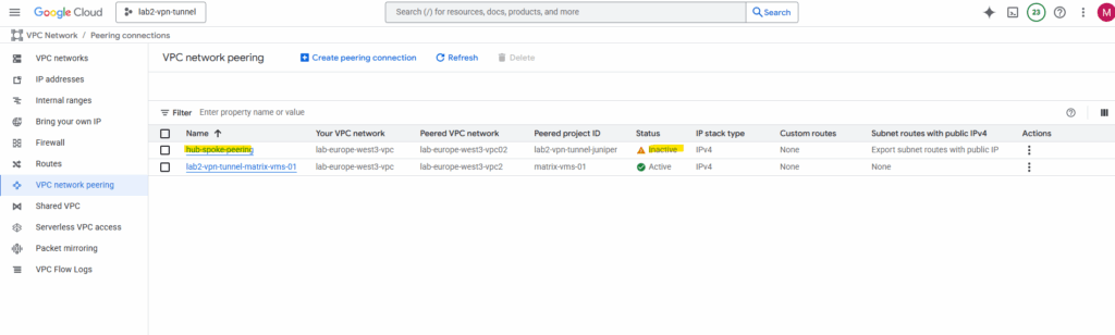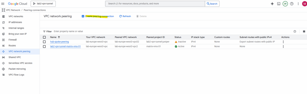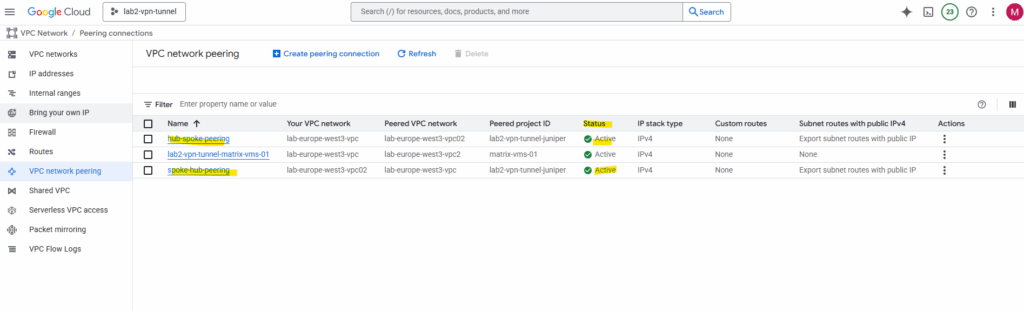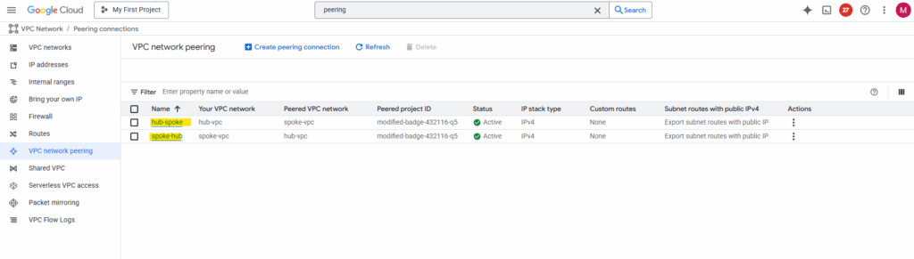 So I will create a new peering between the spoke and hub VPC network on each side (project).