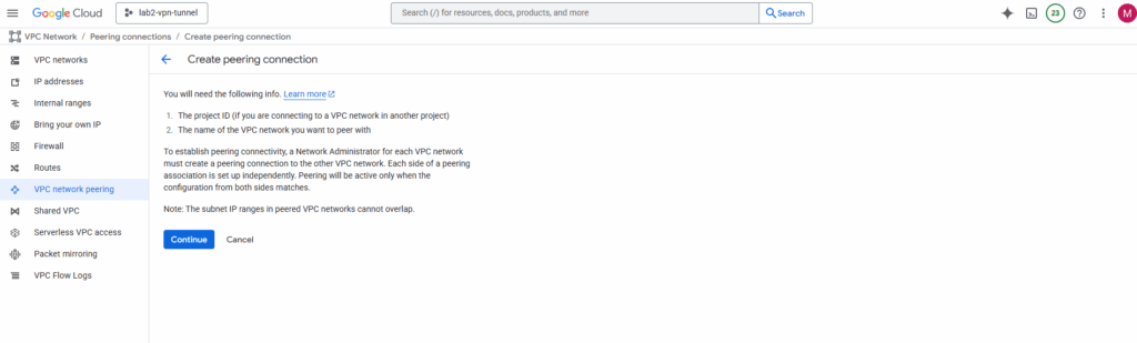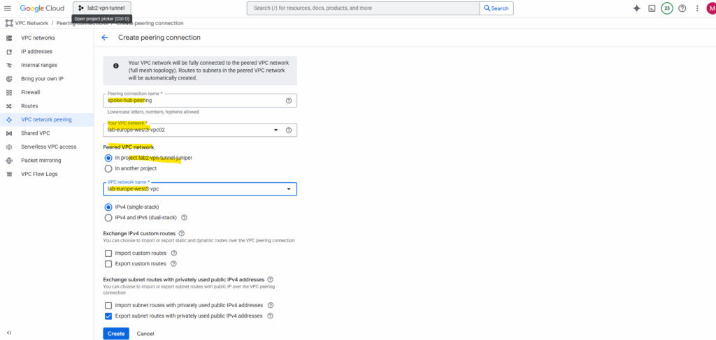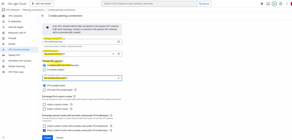 Select the hub VPC network and spoke VPC network and enter a name for. This will create the peering initiated from the spoke network (vice versa this time). Click on Create.