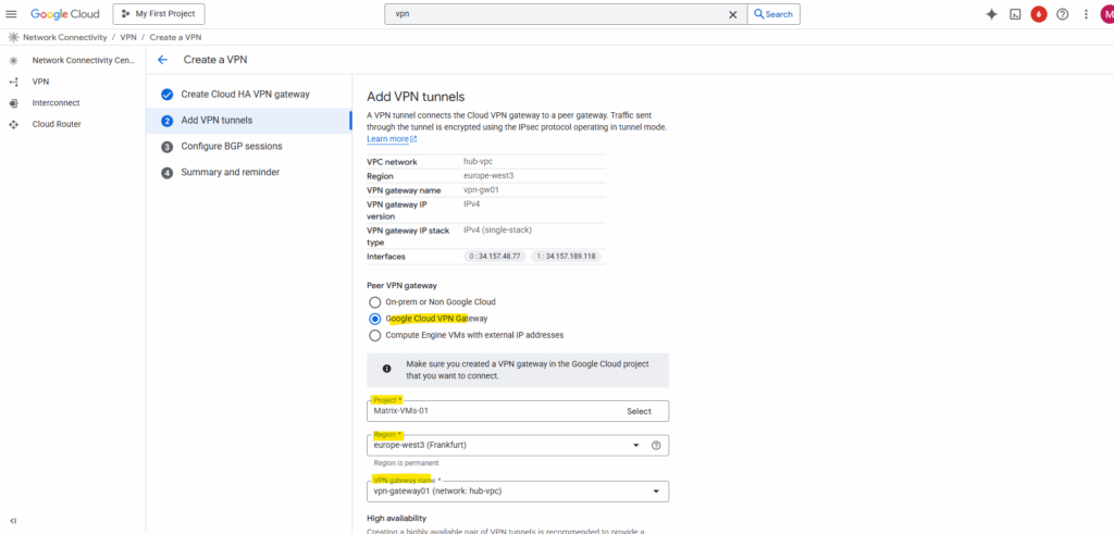 When setting up the VPN tunnel between two GCP projects/VPC networks, we need to select for the peer VPN gateway on both sides (projects/VPC networks) always Google Cloud VPN Gateway. Also select the VPN gateway f