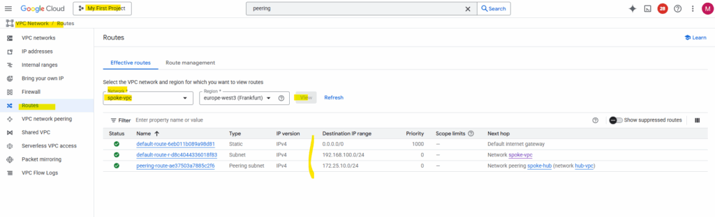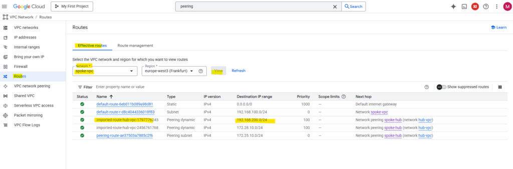 So next I will check the source spoke VPC networks effective routes. Below the destination spoke VPC network from the other side (project) with 192.168.200/24 is missing.