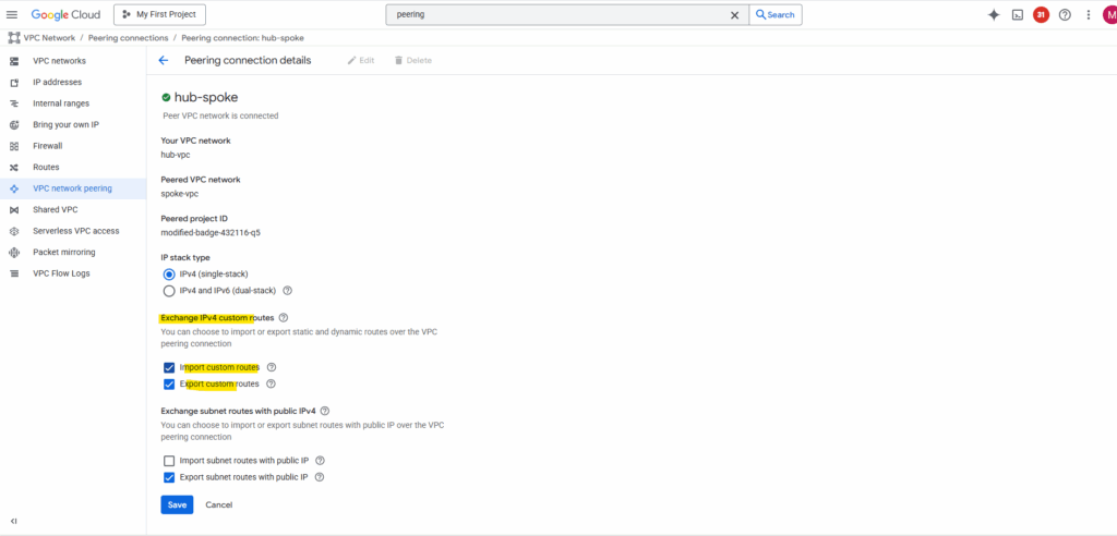 To solve this, in each hub and spoke VPC on both sides (projects), enable custom route exchange by checking the following two check boxes with Import custom routes and Export custom routes.
