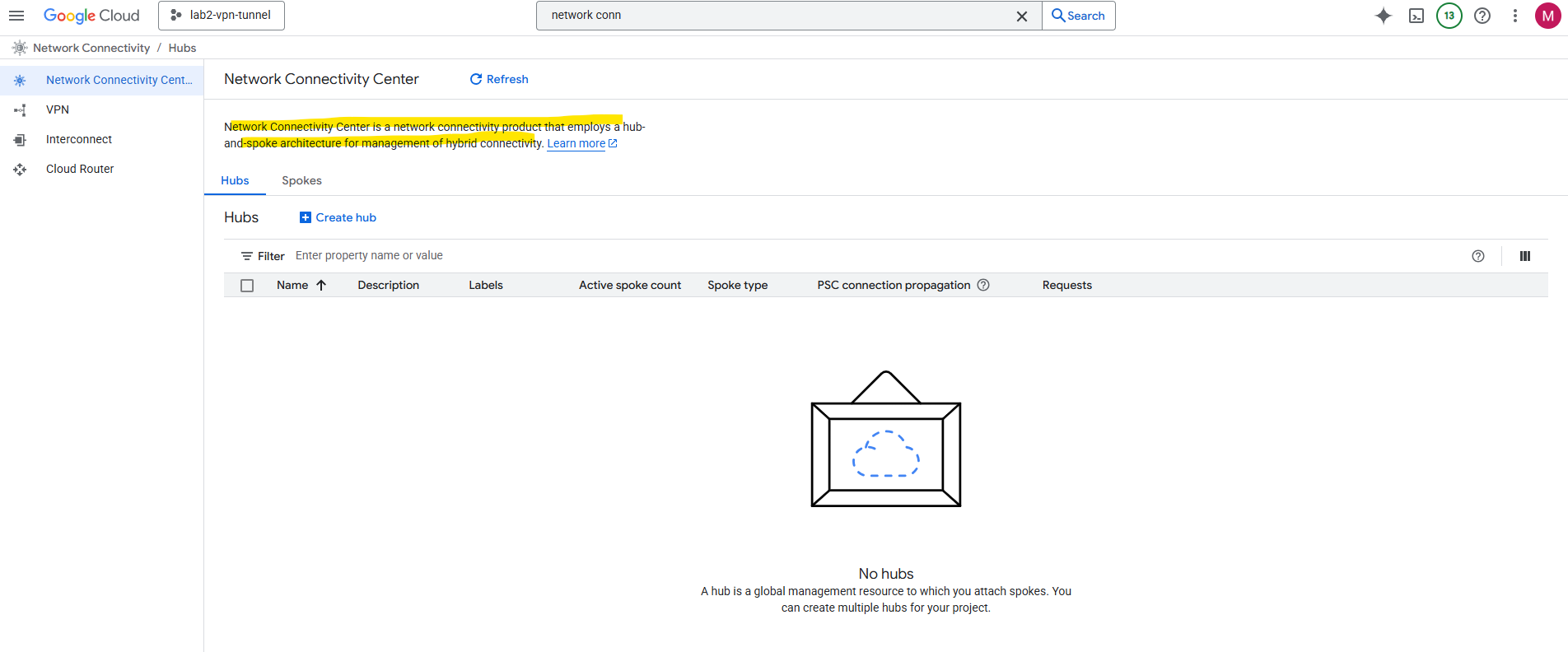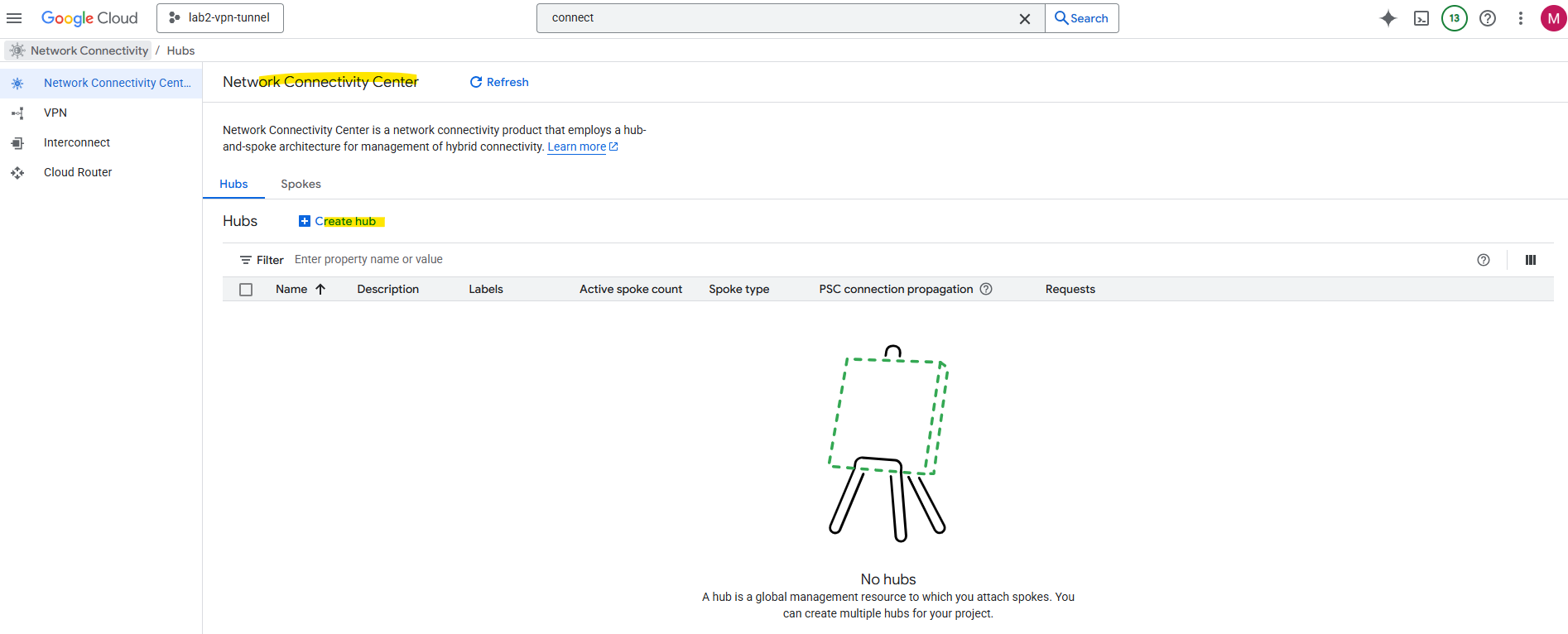 In the Network Connectivity Center on the Hubs tab click on Create Hub.