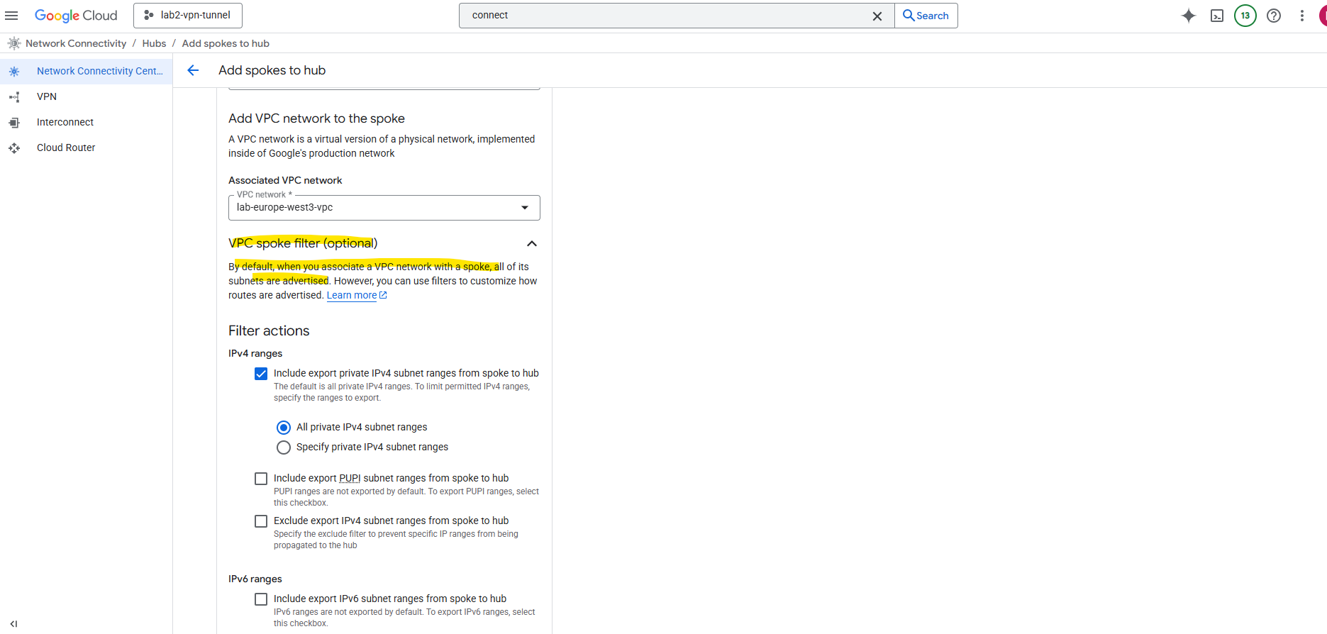 The highlighted 172.17.0.0/24 subnet is from the VPC network including my HA VPN and I was adding as new spoke with the spoke type ==> VPN tunnel.