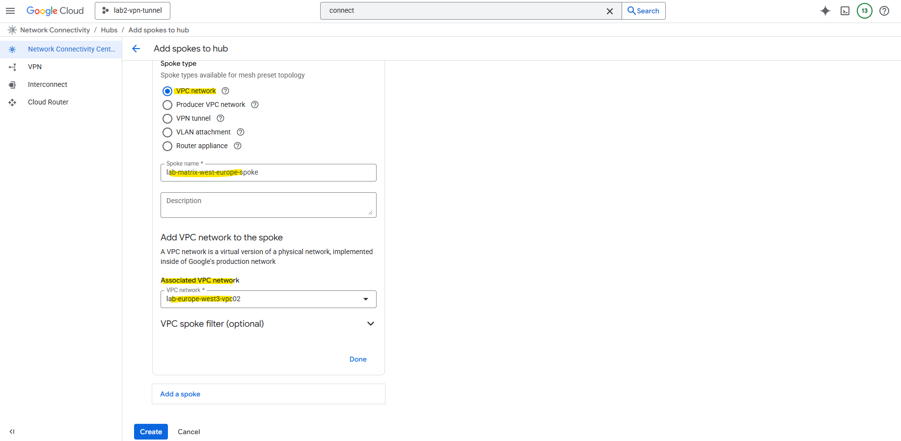 For the spoke type I will use VPC network. Enter a name and select which existing VPC network you want to add as spoke. I will add here the VPC network named lab-europe-west3-vpc02 which I will use for spoke workloads.