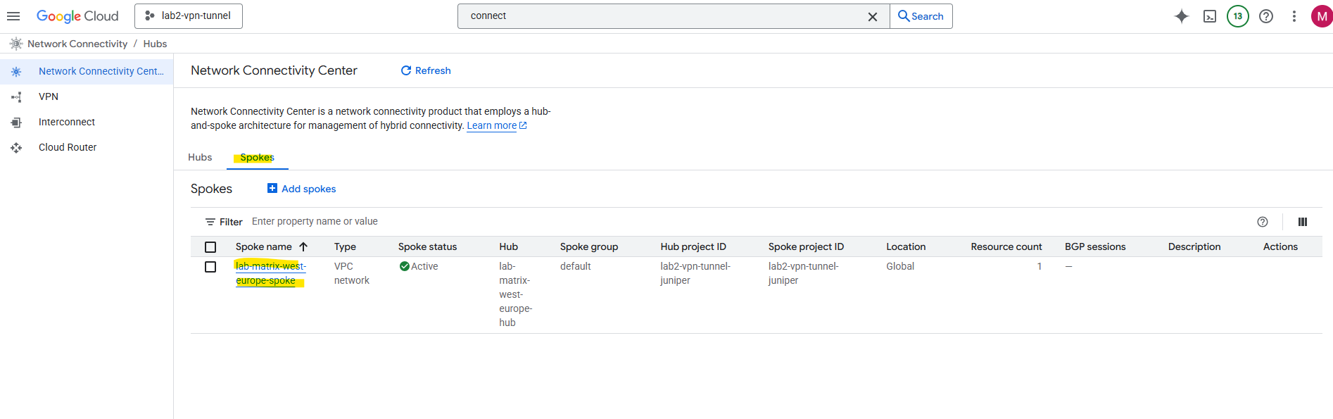 In the Network Connectivity Center on the Spokes tab click on Add spokes.