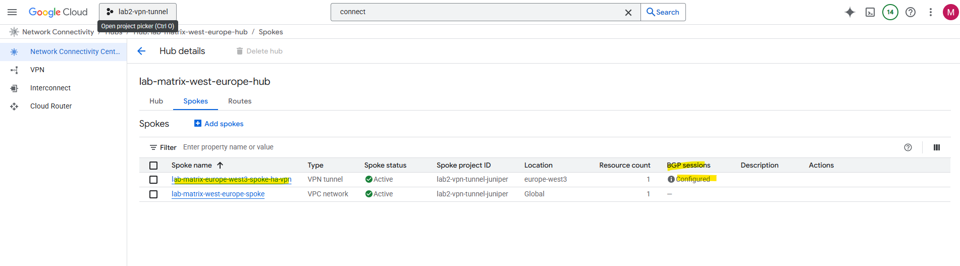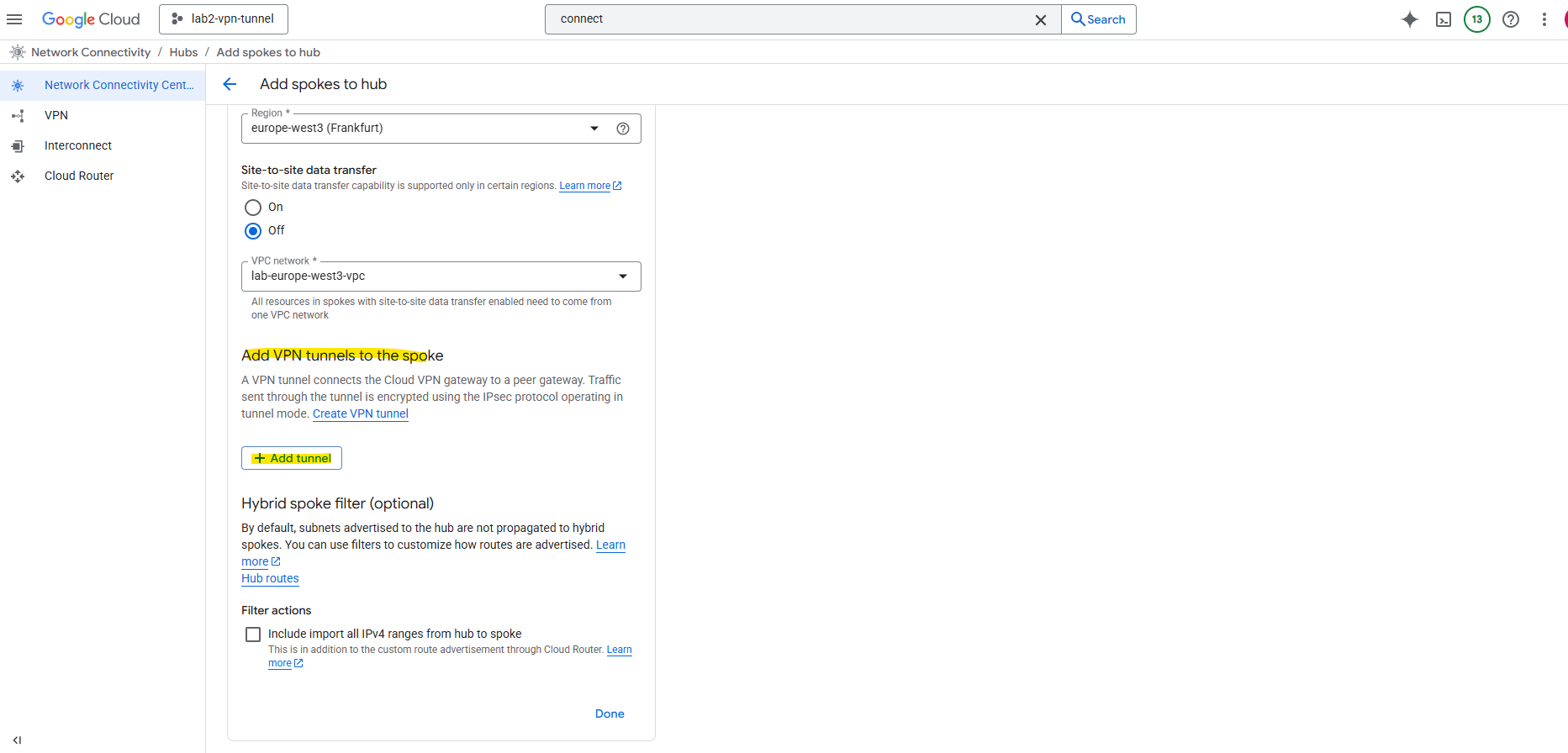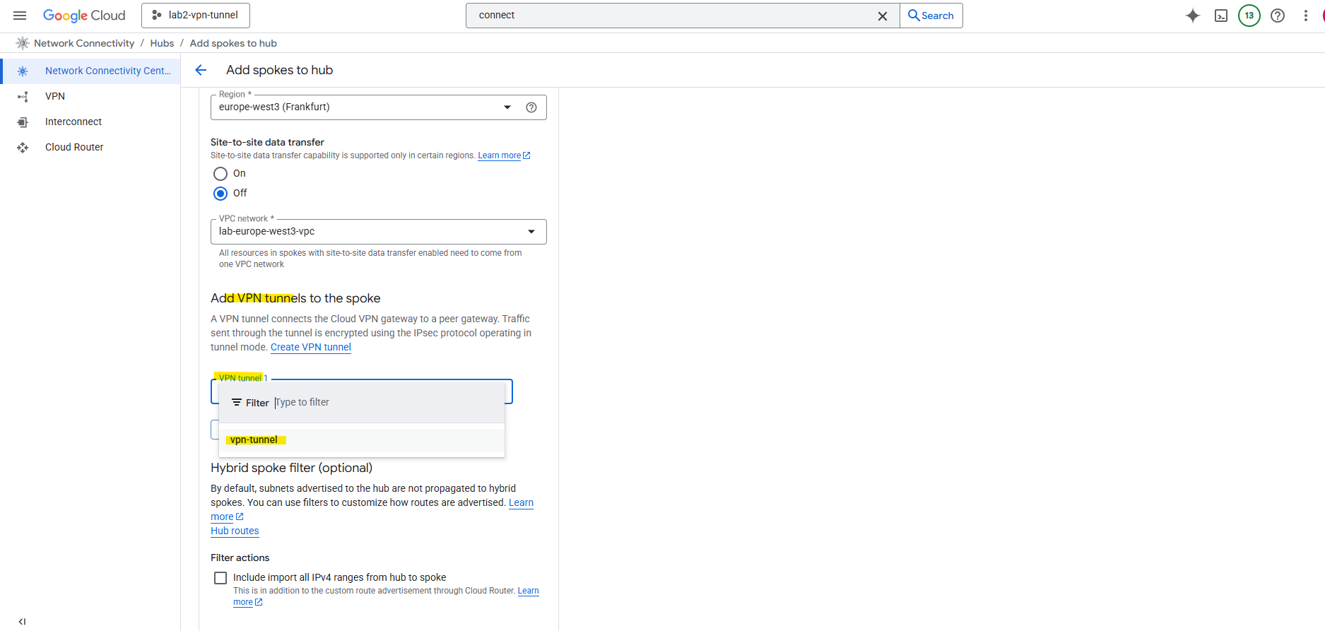 To make our HA VPN available in the hub, we need do add our HA VPN as spoke to our hub.