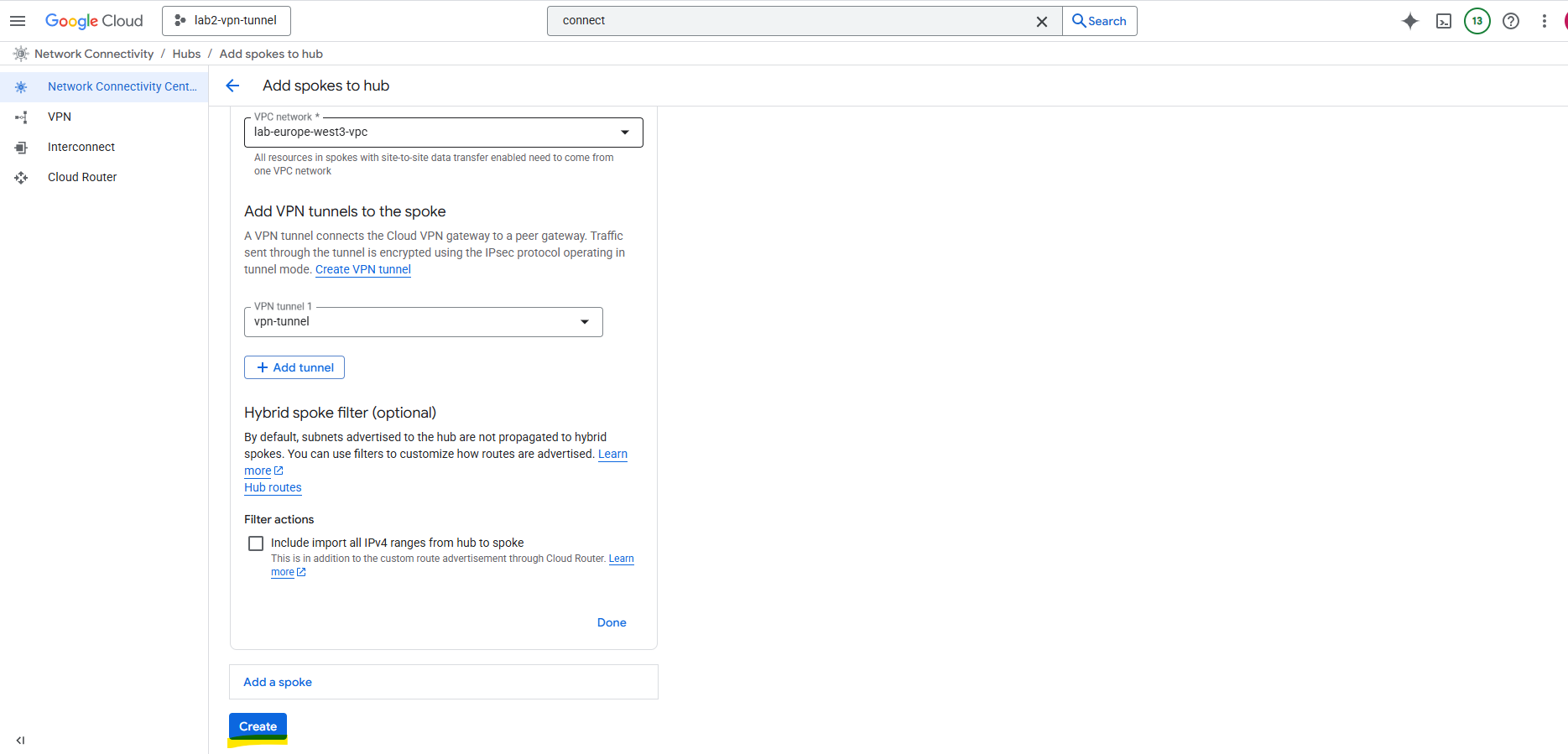 Click on Create. This registers our HA VPN as a spoke so its routes can flow into the hub.