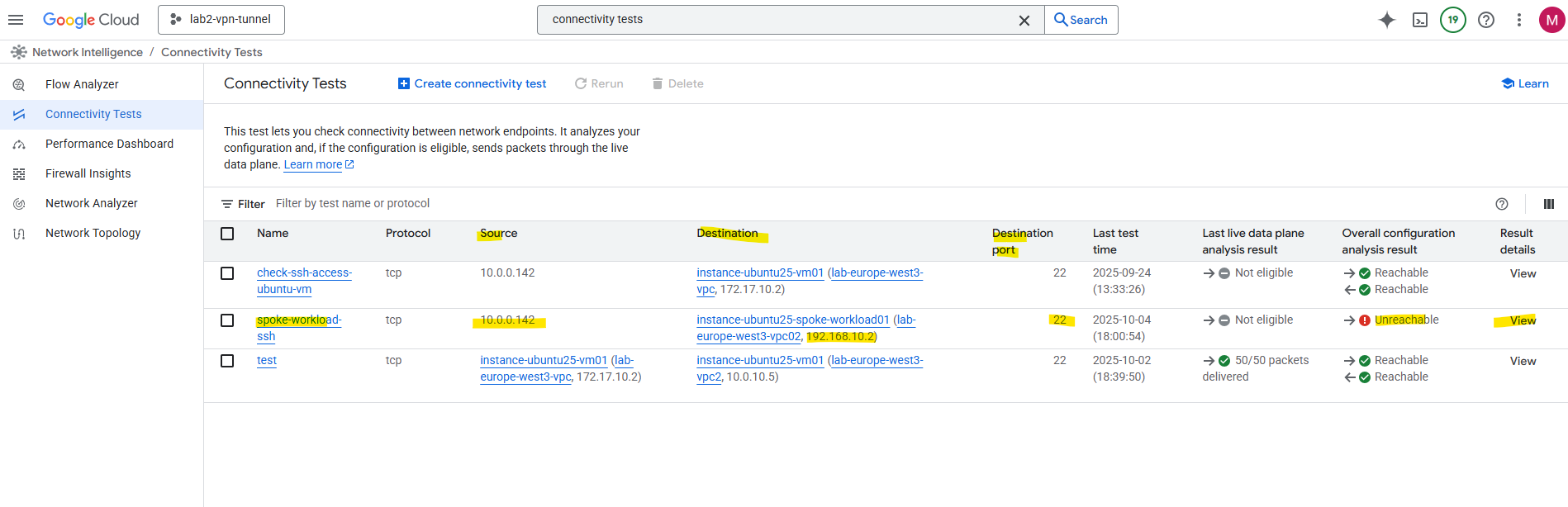 Before I will try to ping (Echo request messages) the VM instance (workload) on the other side (project) and spoke VPC network, I will first run again the connectivity test.