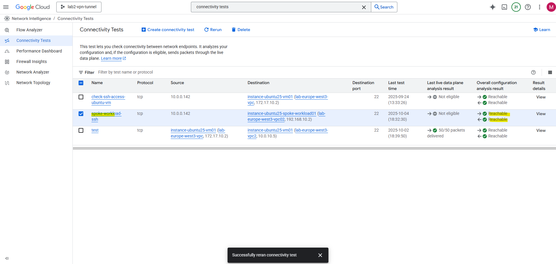 Et voilà, looks good now and regarding the connectivity test traffic can now be sent from the source spoke VPC network and workload successfully to the destination spoke VPC network and workload.