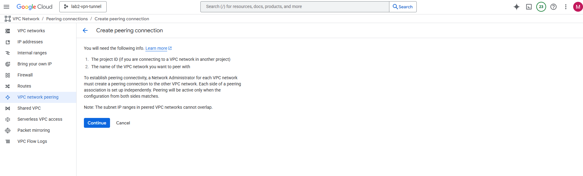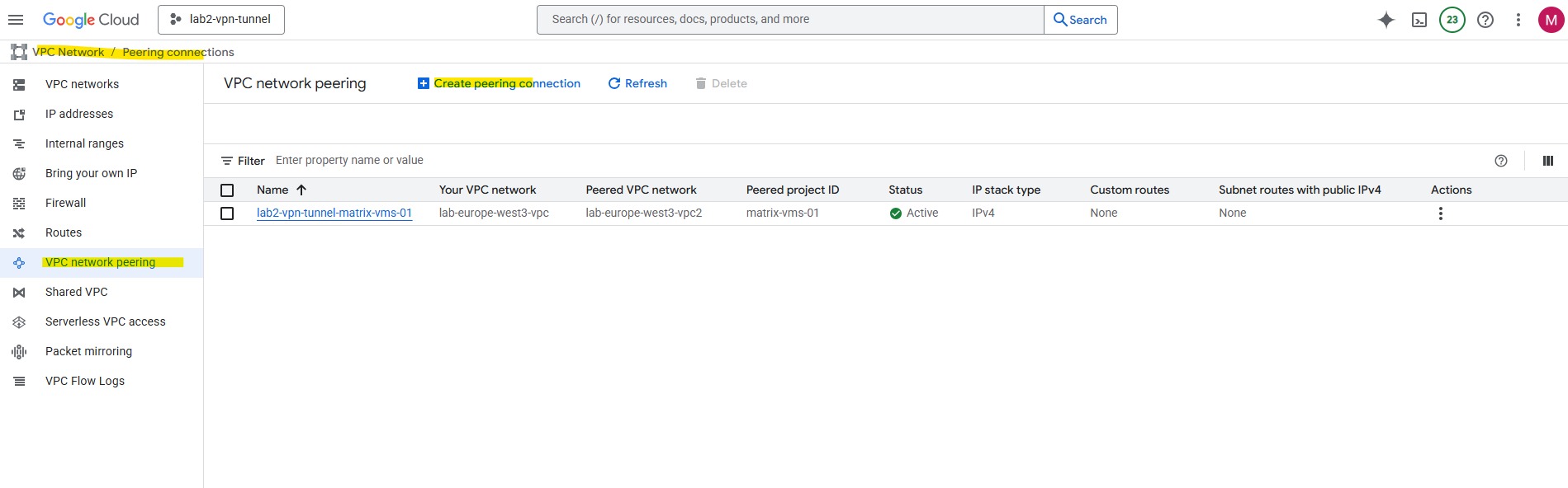 So I will create a new peering between the spoke and hub VPC network on each side (project).