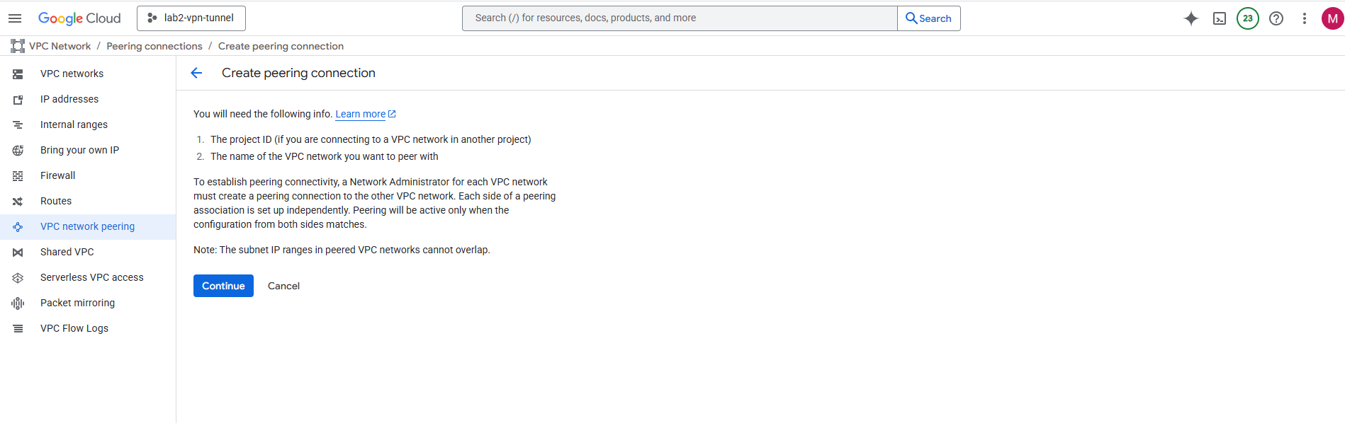 Select the hub VPC network and spoke VPC network and enter a name for. This will create the peering initiated from the spoke network (vice versa this time). Click on Create.