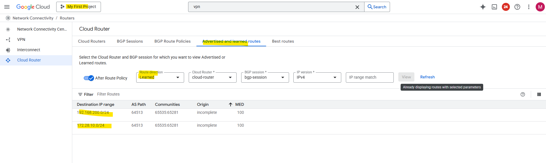 I will check Advertise all subnets visible to the Cloud Router and adding my workload subnet 192.168.10.0/24 which is associated with the spoke.