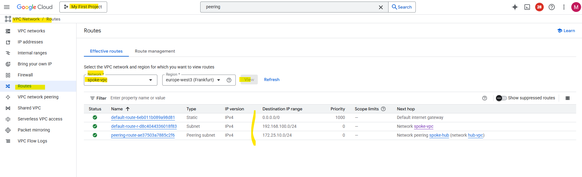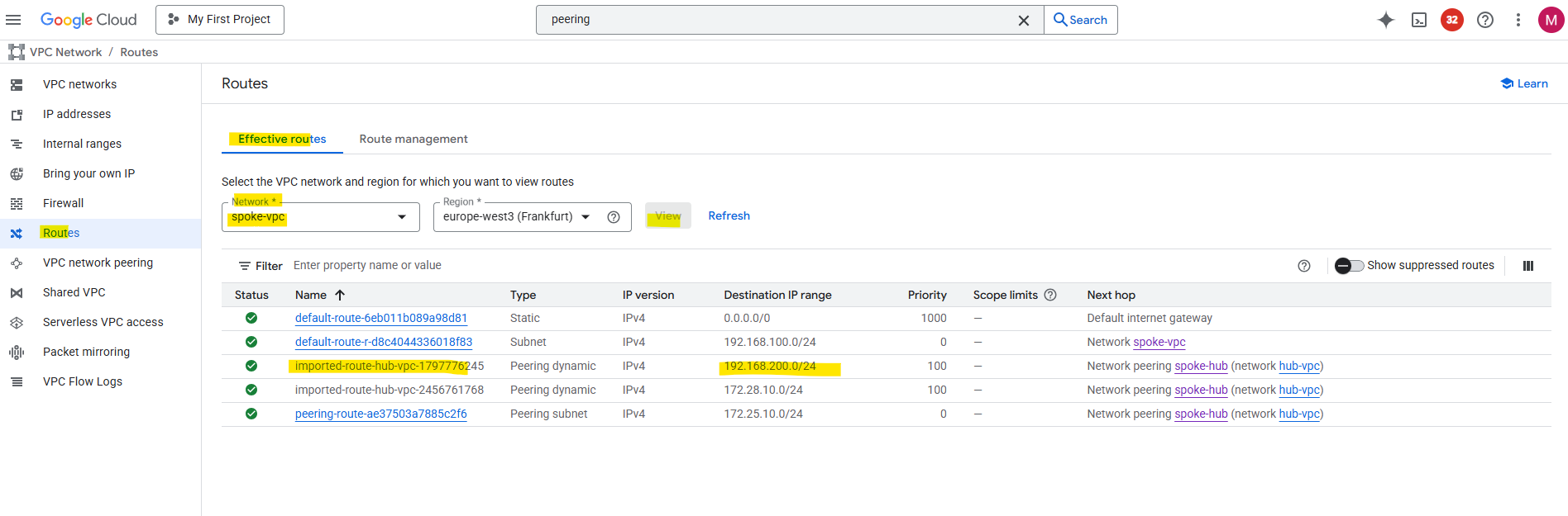 So next I will check the source spoke VPC networks effective routes. Below the destination spoke VPC network from the other side (project) with 192.168.200/24 is missing.