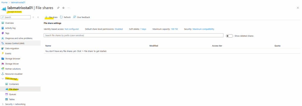 Here you can see my existing Azure File Share within my existing Storage Account. The folders are just native in Azure and have nothing to do with my on-premise DFS namespace shares.