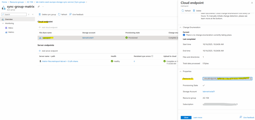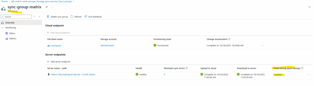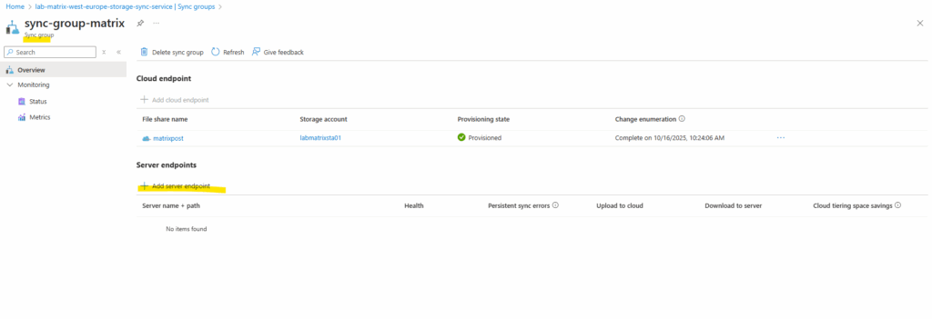 Below so far only the cloud endpoint exists (file share in my storage account we selected previously when creating the sync group), so the next step is to add a server endpoint to connect my on-premises file server and start syncing files between Azure and my lab environment.