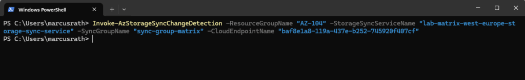 PS> Connect-AzAccount PS> Select-AzSubscription -SubscriptionId <your-subscription-id> PS> Invoke-AzStorageSyncChangeDetection -ResourceGroupName "AZ-104" -StorageSyncServiceName "<StorageSyncServiceName>" -SyncGroupName "<SyncGroupName>" -CloudEndpointName "<Resource ID>"